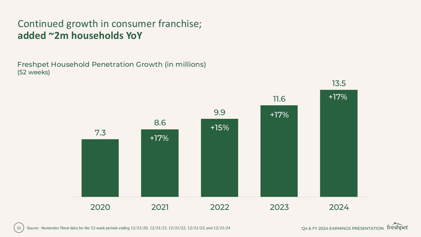 Q4 & FY 2024 EARNINGS PRESENTATION9 Vast runway for growth in a growing category 1. NIQ Total US Pet Food $ - OmniChannel by Category 52 Weeks Ended 12/28/24 2. NIQ MegaChannel 52 Weeks Ended 12/28/24, Gently Cooked Fresh/Frozen Branded Dog Food $54B U.S. pet food category1 $37B Dog food category1 3.4% Freshpet market share of dog food1 Freshpet market share of fresh/frozen in measured channels2 96%