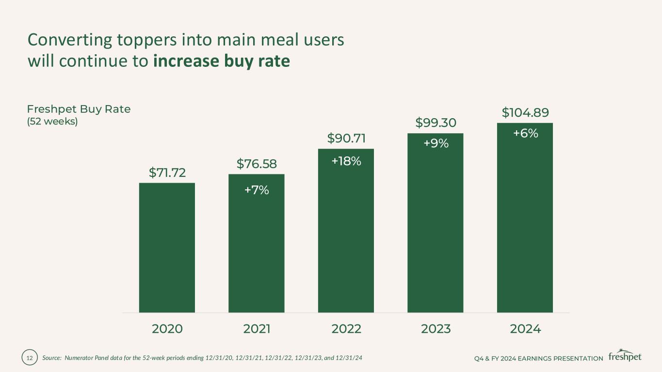 Q4 & FY 2024 EARNINGS PRESENTATION11 0.7 0.9 1.3 1.6 2.1 $426.00 $428.38 $453.95 $477.33 $473.85 415 435 455 475 495 515 0.0 0.5 1.0 1.5 2.0 2.5 2020 2021 2022 2023 2024 Freshpet sales are increasingly concentrated in our heaviest users– now called MVP’s* – and account for 69% of FY 2024 net sales Source: Numerator data for 52-week periods ending 12/31/20, 12/31/21, 12/31/22, 12/31/23, and 12/31/24 *Most Valuable Pet Parents % of total Freshpet households that are Ultra/SH 10% 11% 13% 14% 15% Freshpet Users who are Ultra/Super Heavy Buyers (in millions) Ultra/Super Heavy HHP Ultra/Super Heavy Buy Rate 69% of Freshpet sales