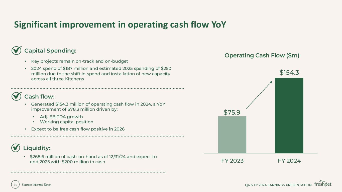 Q4 & FY 2024 EARNINGS PRESENTATION31 Significant improvement in operating cash flow YoY Capital Spending: • Key projects remain on-track and on-budget • 2024 spend of $187 million and estimated 2025 spending of $250 million due to the shift in spend and installation of new capacity across all three Kitchens Cash flow: • Generated $154.3 million of operating cash flow in 2024, a YoY improvement of $78.3 million driven by: • Adj. EBITDA growth • Working capital position • Expect to be free cash flow positive in 2026 Liquidity: • $268.6 million of cash-on-hand as of 12/31/24 and expect to end 2025 with $200 million in cash Operating Cash Flow ($m) $75.9 $154.3 FY 2023 FY 2024 Source: Internal Data