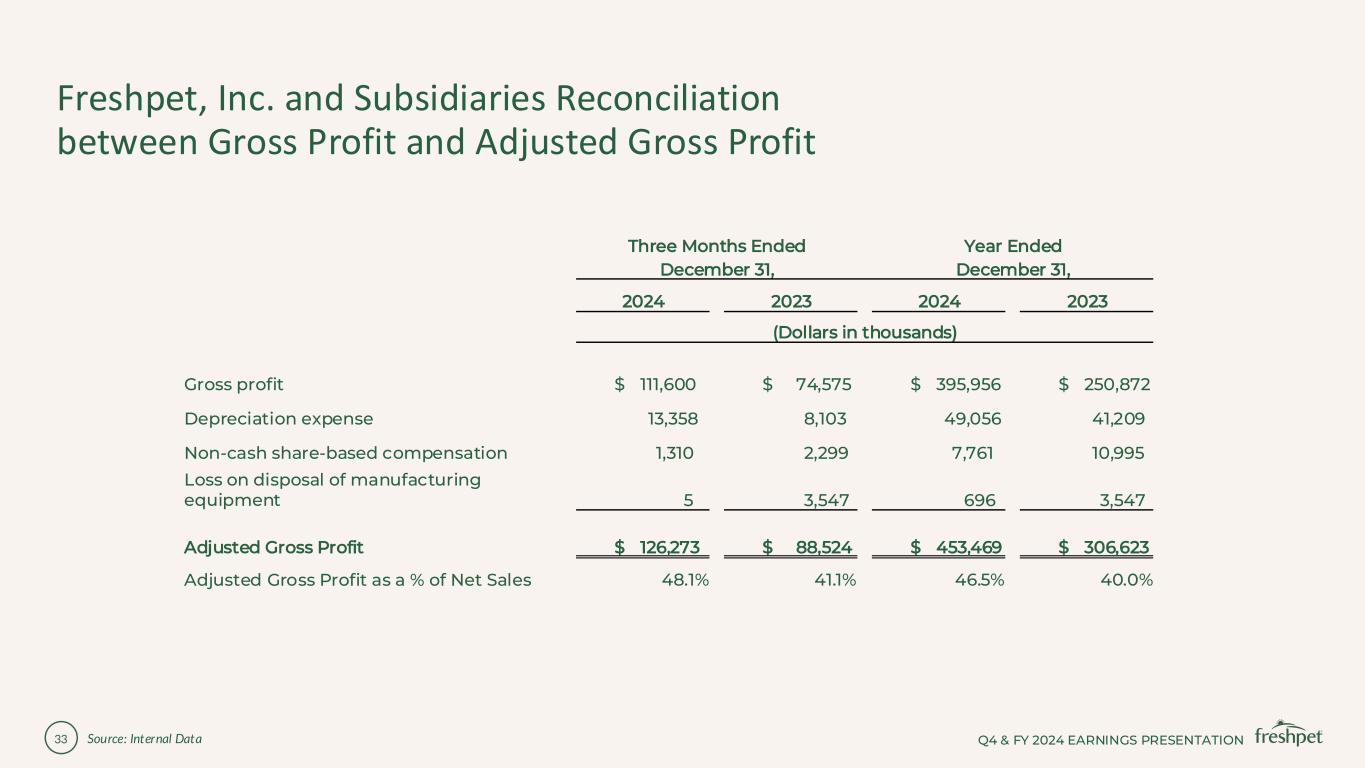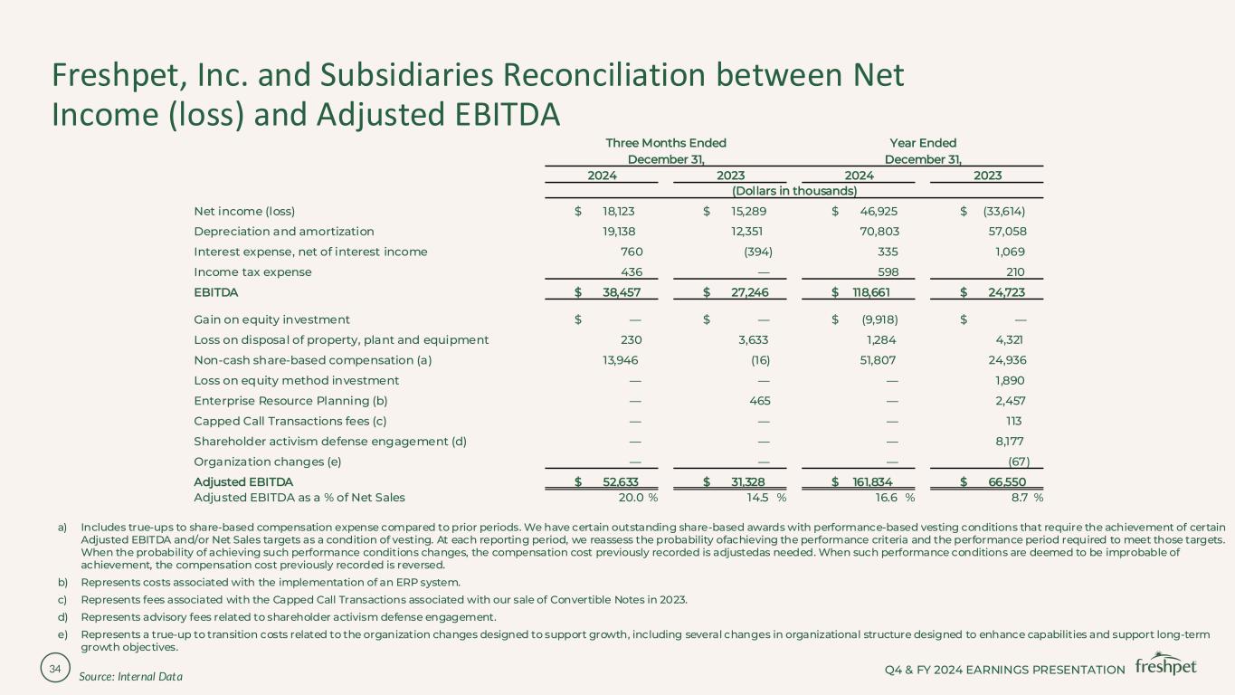 Q4 & FY 2024 EARNINGS PRESENTATION33 Freshpet, Inc. and Subsidiaries Reconciliation between Gross Profit and Adjusted Gross Profit Three Months Ended December 31, Year Ended December 31, 2024 2023 2024 2023 (Dollars in thousands) Gross profit $ 111,600 $ 74,575 $ 395,956 $ 250,872 Depreciation expense 13,358 8,103 49,056 41,209 Non-cash share-based compensation 1,310 2,299 7,761 10,995 Loss on disposal of manufacturing equipment 5 3,547 696 3,547 Adjusted Gross Profit $ 126,273 $ 88,524 $ 453,469 $ 306,623 Adjusted Gross Profit as a % of Net Sales 48.1% 41.1% 46.5% 40.0% Source: Internal Data