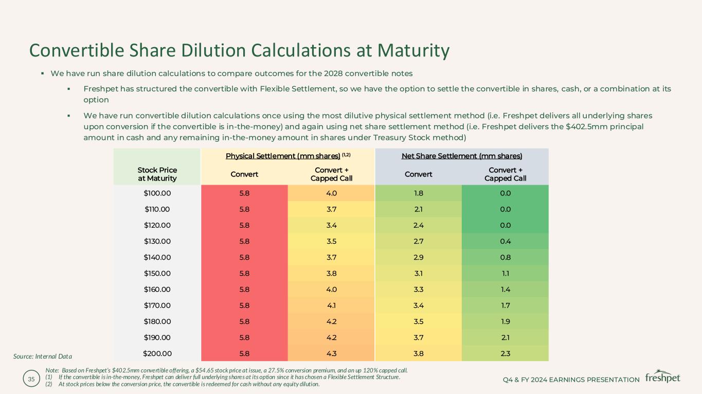 Q4 & FY 2024 EARNINGS PRESENTATION35 Convertible Share Dilution Calculations at Maturity ▪ We have run share dilution calculations to compare outcomes for the 2028 convertible notes ▪ Freshpet has structured the convertible with Flexible Settlement, so we have the option to settle the convertible in shares, cash, or a combination at its option ▪ We have run convertible dilution calculations once using the most dilutive physical settlement method (i.e. ​​Freshpet​ delivers all underlying shares upon conversion if the convertible is in-the-money) and again using net share settlement method (i.e. Freshpet​ delivers the ​​​$402.5​mm principal amount in cash and any remaining in-the-money amount in shares under Treasury Stock method) Note: Based on Freshpet’s ​​$402.5​mm convertible offering, a $54.65​ stock price at issue, a ​​​27.5%​ conversion premium, and an up 120%​ capped call. (1) If the convertible is in-the-money, ​Freshpet​ can deliver full underlying shares at its option since it has chosen a Flexible Settlement Structure. (2) At stock prices below the conversion price, the convertible is redeemed for cash without any equity dilution. Physical Settlement (mm shares) (1,2) Net Share Settlement (mm shares) Stock Price at Maturity Convert Convert + Capped Call Convert Convert + Capped Call $100.00 5.8 4.0 1.8 0.0 $110.00 5.8 3.7 2.1 0.0 $120.00 5.8 3.4 2.4 0.0 $130.00 5.8 3.5 2.7 0.4 $140.00 5.8 3.7 2.9 0.8 $150.00 5.8 3.8 3.1 1.1 $160.00 5.8 4.0 3.3 1.4 $170.00 5.8 4.1 3.4 1.7 $180.00 5.8 4.2 3.5 1.9 $190.00 5.8 4.2 3.7 2.1 $200.00 5.8 4.3 3.8 2.3Source: Internal Data