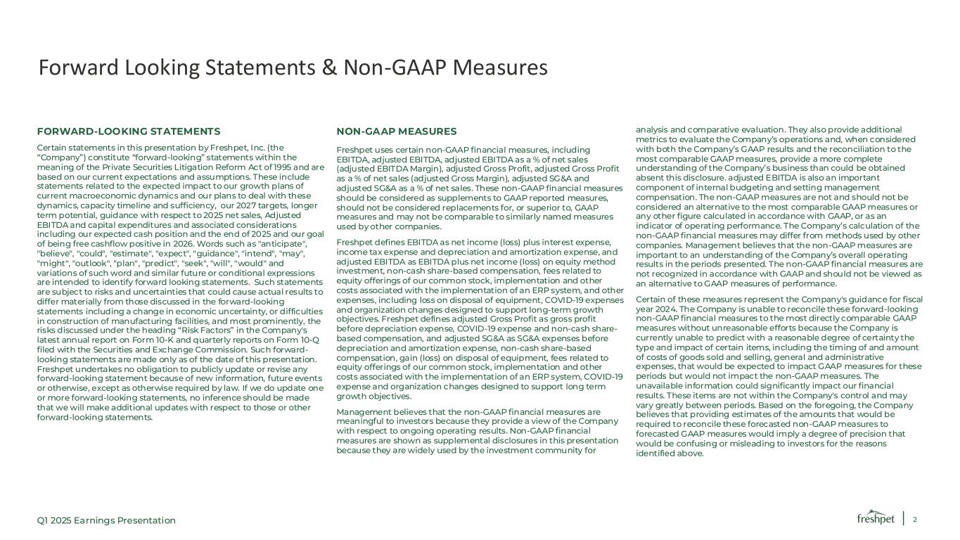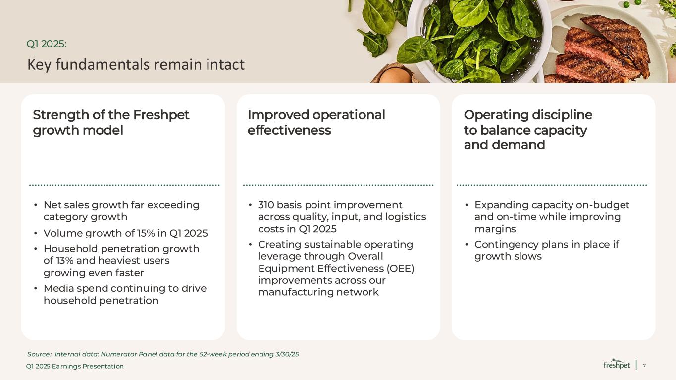 Q1 2025 Earnings Presentation 2 Forward Looking Statements & Non-GAAP Measures FORWARD-LOOKING STATEMENTS Certain statements in this presentation by Freshpet, Inc. (the “Company”) constitute “forward-looking” statements within the meaning of the Private Securities Litigation Reform Act of 1995 and are based on our current expectations and assumptions. These include statements related to the expected impact to our growth plans of current macroeconomic dynamics and our plans to deal with these dynamics, capacity timeline and sufficiency, our 2027 targets, longer term potential, guidance with respect to 2025 net sales, Adjusted EBITDA and capital expenditures and associated considerations including our expected cash position and the end of 2025 and our goal of being free cashflow positive in 2026. Words such as "anticipate", "believe", "could", "estimate", "expect", "guidance", "intend", "may", "might", "outlook", "plan", "predict", "seek", "will", "would" and variations of such word and similar future or conditional expressions are intended to identify forward looking statements. Such statements are subject to risks and uncertainties that could cause actual results to differ materially from those discussed in the forward-looking statements including a change in economic uncertainty, or difficulties in construction of manufacturing facilities, and most prominently, the risks discussed under the heading “Risk Factors” in the Company's latest annual report on Form 10-K and quarterly reports on Form 10-Q filed with the Securities and Exchange Commission. Such forward- looking statements are made only as of the date of this presentation. Freshpet undertakes no obligation to publicly update or revise any forward-looking statement because of new information, future events or otherwise, except as otherwise required by law. If we do update one or more forward-looking statements, no inference should be made that we will make additional updates with respect to those or other forward-looking statements. NON-GAAP MEASURES Freshpet uses certain non-GAAP financial measures, including EBITDA, adjusted EBITDA, adjusted EBITDA as a % of net sales (adjusted EBITDA Margin), adjusted Gross Profit, adjusted Gross Profit as a % of net sales (adjusted Gross Margin), adjusted SG&A and adjusted SG&A as a % of net sales. These non-GAAP financial measures should be considered as supplements to GAAP reported measures, should not be considered replacements for, or superior to, GAAP measures and may not be comparable to similarly named measures used by other companies. Freshpet defines EBITDA as net income (loss) plus interest expense, income tax expense and depreciation and amortization expense, and adjusted EBITDA as EBITDA plus net income (loss) on equity method investment, non-cash share-based compensation, fees related to equity offerings of our common stock, implementation and other costs associated with the implementation of an ERP system, and other expenses, including loss on disposal of equipment, COVID-19 expenses and organization changes designed to support long-term growth objectives. Freshpet defines adjusted Gross Profit as gross profit before depreciation expense, COVID-19 expense and non-cash share- based compensation, and adjusted SG&A as SG&A expenses before depreciation and amortization expense, non-cash share-based compensation, gain (loss) on disposal of equipment, fees related to equity offerings of our common stock, implementation and other costs associated with the implementation of an ERP system, COVID-19 expense and organization changes designed to support long term growth objectives. Management believes that the non-GAAP financial measures are meaningful to investors because they provide a view of the Company with respect to ongoing operating results. Non-GAAP financial measures are shown as supplemental disclosures in this presentation because they are widely used by the investment community for analysis and comparative evaluation. They also provide additional metrics to evaluate the Company’s operations and, when considered with both the Company’s GAAP results and the reconciliation to the most comparable GAAP measures, provide a more complete understanding of the Company’s business than could be obtained absent this disclosure. adjusted EBITDA is also an important component of internal budgeting and setting management compensation. The non-GAAP measures are not and should not be considered an alternative to the most comparable GAAP measures or any other figure calculated in accordance with GAAP, or as an indicator of operating performance. The Company’s calculation of the non-GAAP financial measures may differ from methods used by other companies. Management believes that the non-GAAP measures are important to an understanding of the Company’s overall operating results in the periods presented. The non-GAAP financial measures are not recognized in accordance with GAAP and should not be viewed as an alternative to GAAP measures of performance. Certain of these measures represent the Company's guidance for fiscal year 2024. The Company is unable to reconcile these forward-looking non-GAAP financial measures to the most directly comparable GAAP measures without unreasonable efforts because the Company is currently unable to predict with a reasonable degree of certainty the type and impact of certain items, including the timing of and amount of costs of goods sold and selling, general and administrative expenses, that would be expected to impact GAAP measures for these periods but would not impact the non-GAAP measures. The unavailable information could significantly impact our financial results. These items are not within the Company's control and may vary greatly between periods. Based on the foregoing, the Company believes that providing estimates of the amounts that would be required to reconcile these forecasted non-GAAP measures to forecasted GAAP measures would impl