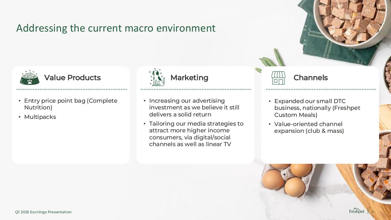 Q1 2025 Earnings Presentation 7 Key fundamentals remain intact Q1 2025: • Net sales growth far exceeding category growth • Volume growth of 15% in Q1 2025 • Household penetration growth of 13% and heaviest users growing even faster • Media spend continuing to drive household penetration • 310 basis point improvement across quality, input, and logistics costs in Q1 2025 • Creating sustainable operating leverage through Overall Equipment Effectiveness (OEE) improvements across our manufacturing network • Expanding capacity on-budget and on-time while improving margins • Contingency plans in place if growth slows Strength of the Freshpet growth model Improved operational effectiveness Operating discipline to balance capacity and demand Source: Internal data; Numerator Panel data for the 52-week period ending 3/30/25