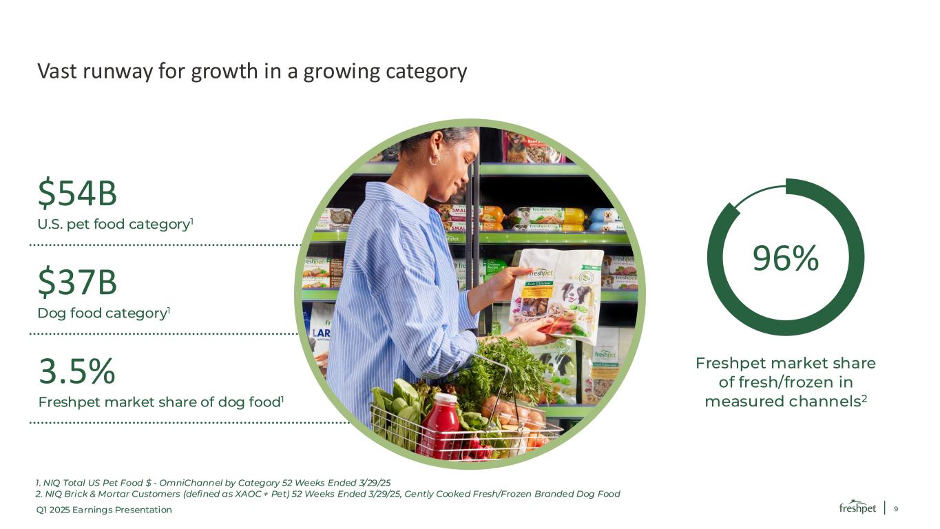 Q1 2025 Earnings Presentation 8 Addressing the current macro environment • Entry price point bag (Complete Nutrition) • Multipacks • Increasing our advertising investment as we believe it still delivers a solid return • Tailoring our media strategies to attract more higher income consumers, via digital/social channels as well as linear TV • Expanded our small DTC business, nationally (Freshpet Custom Meals) • Value-oriented channel expansion (club & mass) Value Products Marketing Channels