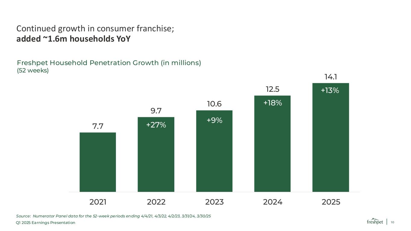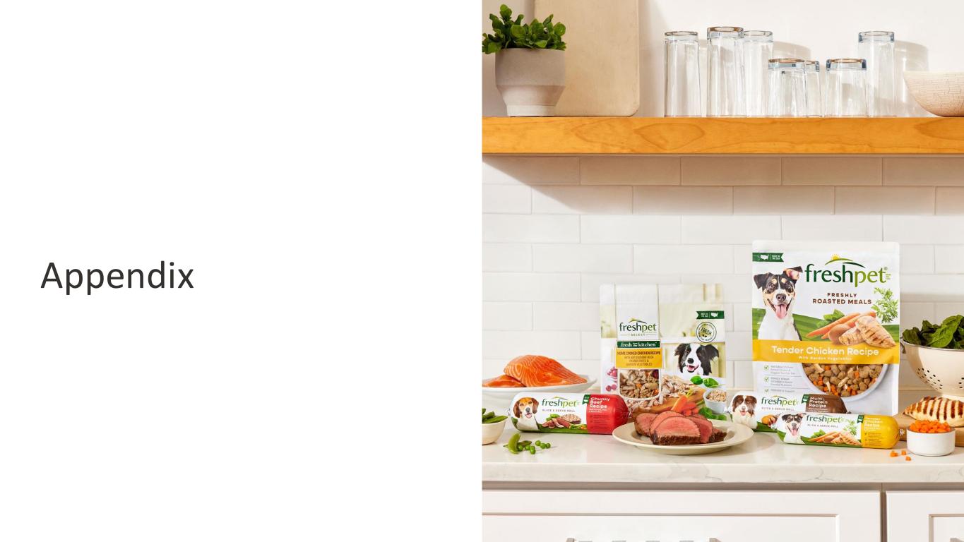 Q1 2025 Earnings Presentation 9 Vast runway for growth in a growing category 1. NIQ Total US Pet Food $ - OmniChannel by Category 52 Weeks Ended 3/29/25 2. NIQ Brick & Mortar Customers (defined as XAOC + Pet) 52 Weeks Ended 3/29/25, Gently Cooked Fresh/Frozen Branded Dog Food $54B U.S. pet food category1 $37B Dog food category1 3.5% Freshpet market share of dog food1 Freshpet market share of fresh/frozen in measured channels2 96%