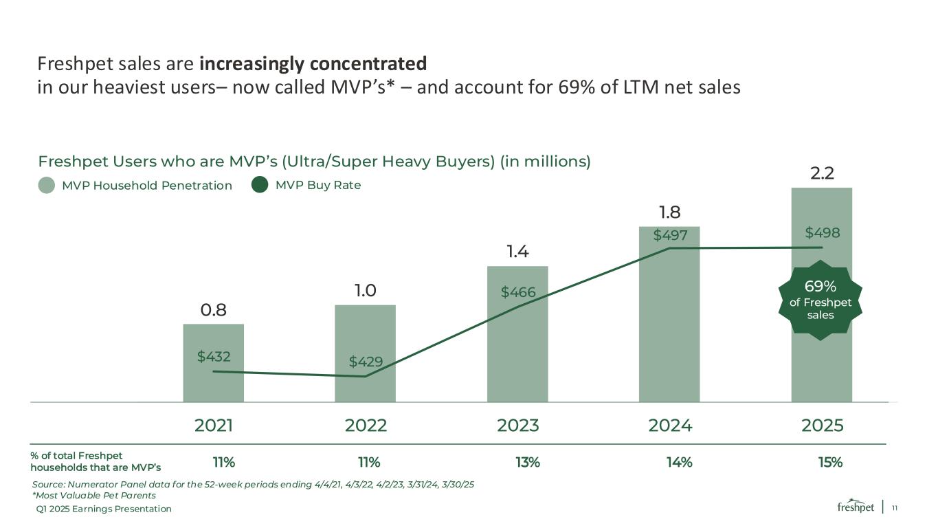 Q1 2025 Earnings Presentation 10 7.7 9.7 10.6 12.5 14.1 2021 2022 2023 2024 2025 +18% +13% +9%+27% Continued growth in consumer franchise; added ~1.6m households YoY Source: Numerator Panel data for the 52-week periods ending 4/4/21, 4/3/22, 4/2/23, 3/31/24, 3/30/25 Freshpet Household Penetration Growth (in millions) (52 weeks)
