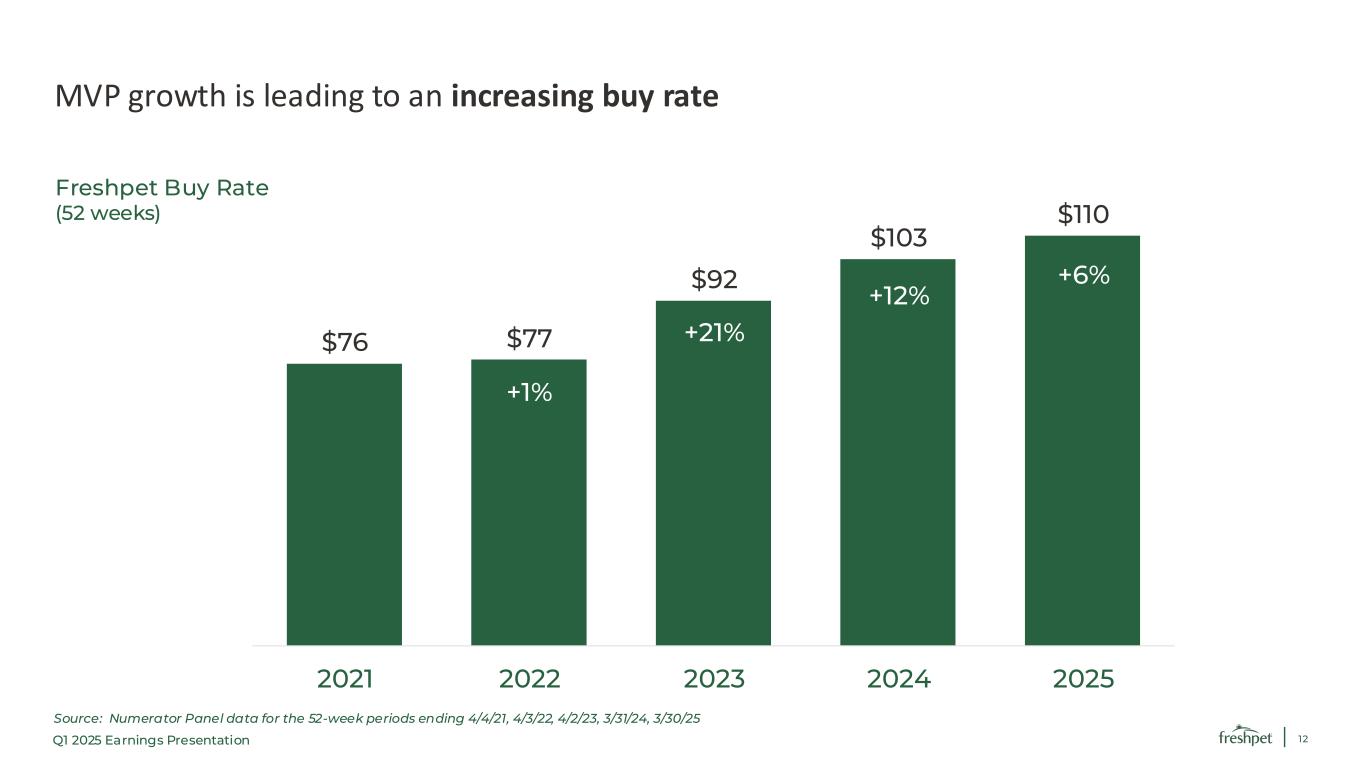 Q1 2025 Earnings Presentation 11 0.8 1.0 1.4 1.8 2.2 $432 $429 $466 $497 $498 415 435 455 475 495 515 535 0.0 0.5 1.0 1.5 2.0 2.5 2021 2022 2023 2024 2025 Freshpet sales are increasingly concentrated in our heaviest users– now called MVP’s* – and account for 69% of LTM net sales Source: Numerator Panel data for the 52-week periods ending 4/4/21, 4/3/22, 4/2/23, 3/31/24, 3/30/25 *Most Valuable Pet Parents % of total Freshpet households that are MVP’s 11% 11% 13% 14% 15% Freshpet Users who are MVP’s (Ultra/Super Heavy Buyers) (in millions) MVP Household Penetration MVP Buy Rate 69% of Freshpet sales