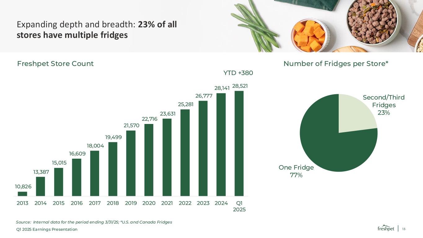 Q1 2025 Earnings Presentation 12 $76 $77 $92 $103 $110 2021 2022 2023 2024 2025 MVP growth is leading to an increasing buy rate Freshpet Buy Rate (52 weeks) +6% +12% +21% +1% Source: Numerator Panel data for the 52-week periods ending 4/4/21, 4/3/22, 4/2/23, 3/31/24, 3/30/25