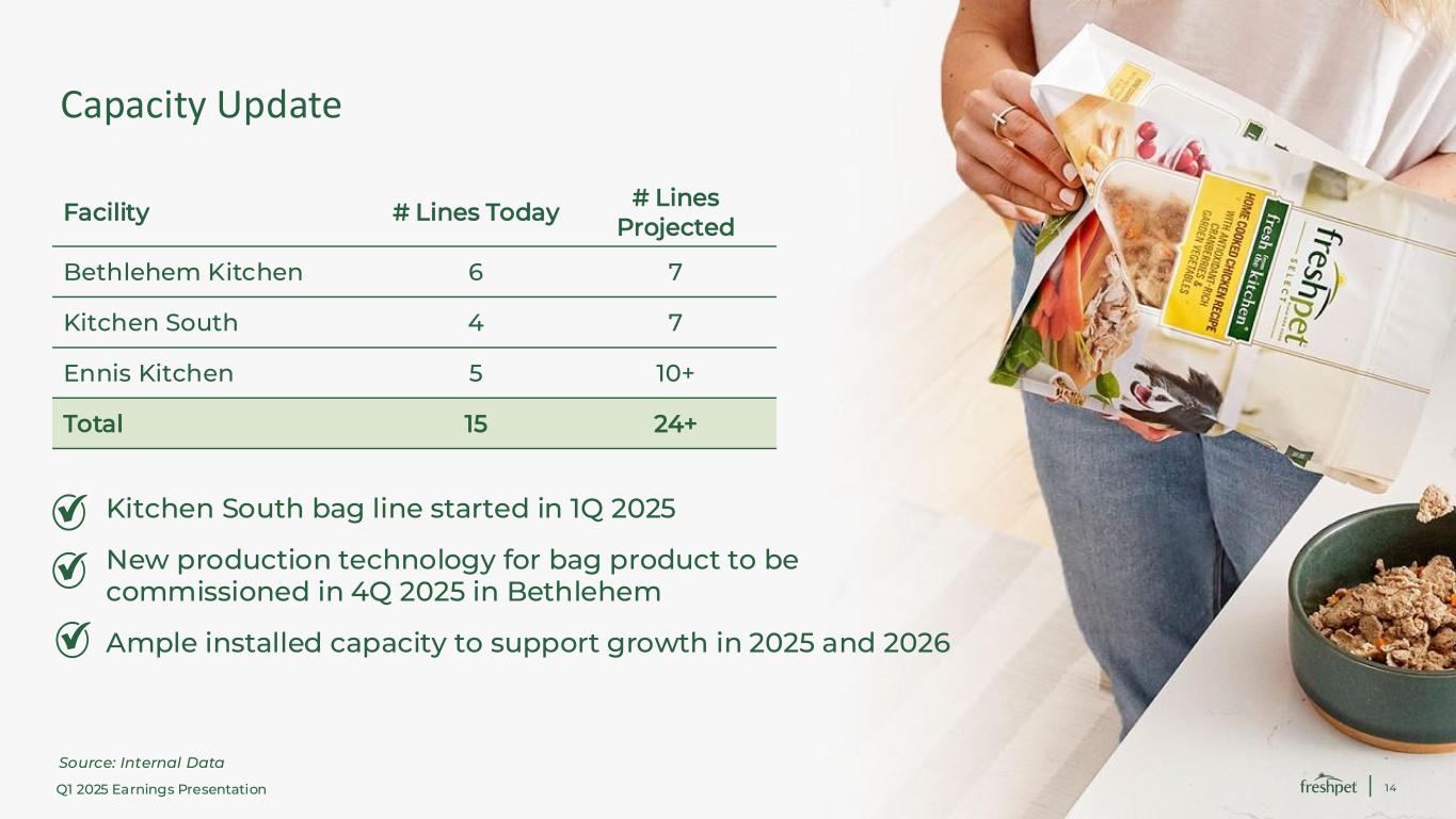 Q1 2025 Earnings Presentation 14 Capacity Update Source: Internal Data Facility # Lines Today # Lines Projected Bethlehem Kitchen 6 7 Kitchen South 4 7 Ennis Kitchen 5 10+ Total 15 24+ Kitchen South bag line started in 1Q 2025 New production technology for bag product to be commissioned in 4Q 2025 in Bethlehem Ample installed capacity to support growth in 2025 and 2026