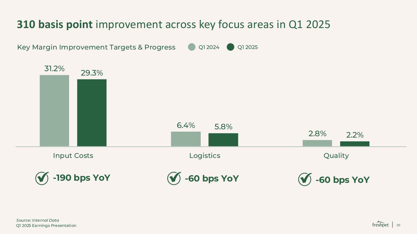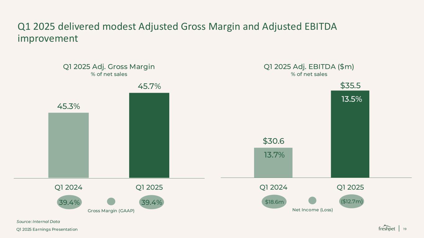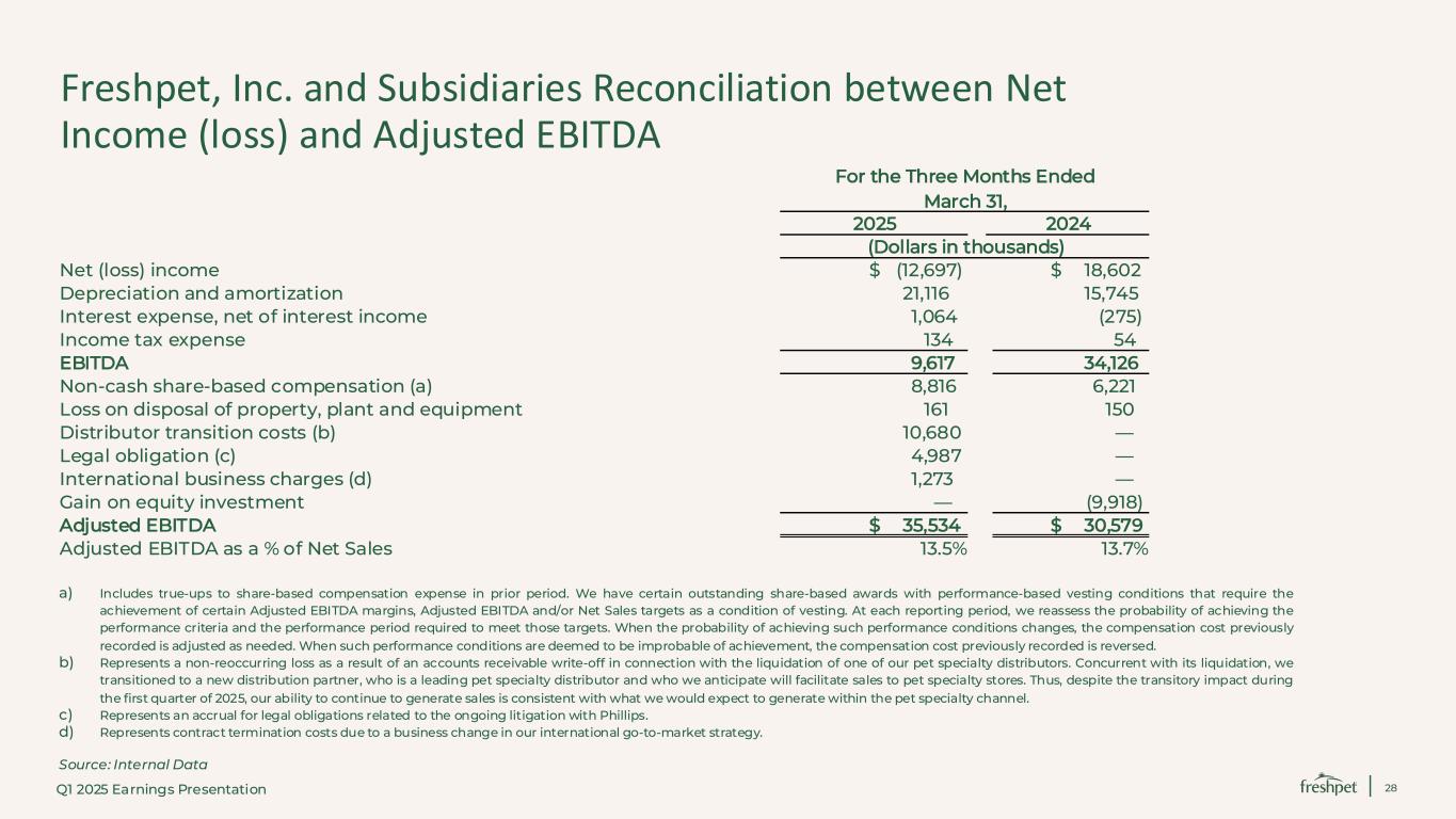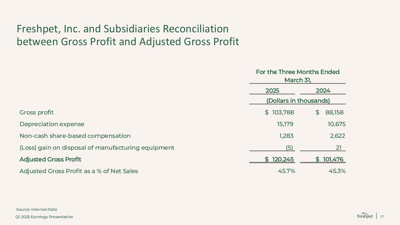 Q1 2025 Earnings Presentation 27 Freshpet, Inc. and Subsidiaries Reconciliation between Gross Profit and Adjusted Gross Profit Source: Internal Data For the Three Months Ended March 31, 2025 2024 (Dollars in thousands) Gross profit $ 103,788 $ 88,158 Depreciation expense 15,179 10,675 Non-cash share-based compensation 1,283 2,622 (Loss) gain on disposal of manufacturing equipment (5) 21 Adjusted Gross Profit $ 120,245 $ 101,476 Adjusted Gross Profit as a % of Net Sales 45.7% 45.3%