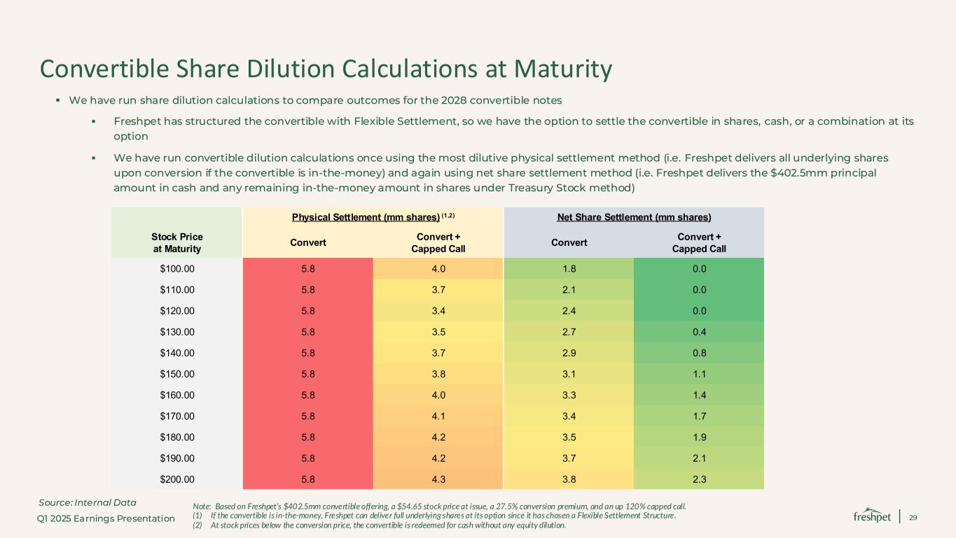 Q1 2025 Earnings Presentation 29 Convertible Share Dilution Calculations at Maturity ▪ We have run share dilution calculations to compare outcomes for the 2028 convertible notes ▪ Freshpet has structured the convertible with Flexible Settlement, so we have the option to settle the convertible in shares, cash, or a combination at its option ▪ We have run convertible dilution calculations once using the most dilutive physical settlement method (i.e. ​​Freshpet​ delivers all underlying shares upon conversion if the convertible is in-the-money) and again using net share settlement method (i.e. Freshpet​ delivers the ​​​$402.5​mm principal amount in cash and any remaining in-the-money amount in shares under Treasury Stock method) Note: Based on Freshpet’s ​​$402.5​mm convertible offering, a $54.65​ stock price at issue, a ​​​27.5%​ conversion premium, and an up 120%​ capped call. (1) If the convertible is in-the-money, ​Freshpet​ can deliver full underlying shares at its option since it has chosen a Flexible Settlement Structure. (2) At stock prices below the conversion price, the convertible is redeemed for cash without any equity dilution. Physical Settlement (mm shares) (1,2) Net Share Settlement (mm shares) Stock Price at Maturity Convert Convert + Capped Call Convert Convert + Capped Call $100.00 5.8 4.0 1.8 0.0 $110.00 5.8 3.7 2.1 0.0 $120.00 5.8 3.4 2.4 0.0 $130.00 5.8 3.5 2.7 0.4 $140.00 5.8 3.7 2.9 0.8 $150.00 5.8 3.8 3.1 1.1 $160.00 5.8 4.0 3.3 1.4 $170.00 5.8 4.1 3.4 1.7 $180.00 5.8 4.2 3.5 1.9 $190.00 5.8 4.2 3.7 2.1 $200.00 5.8 4.3 3.8 2.3 Source: Internal Data