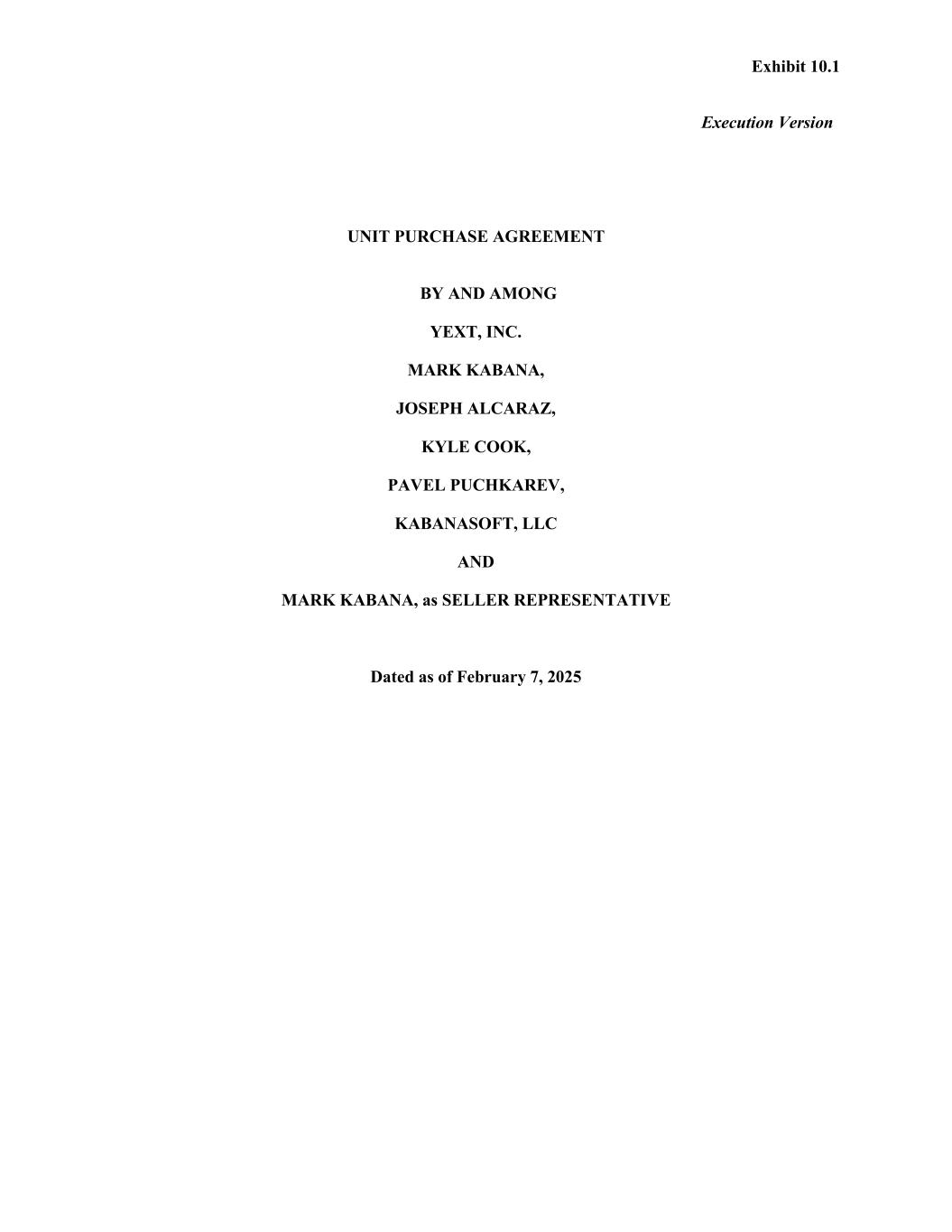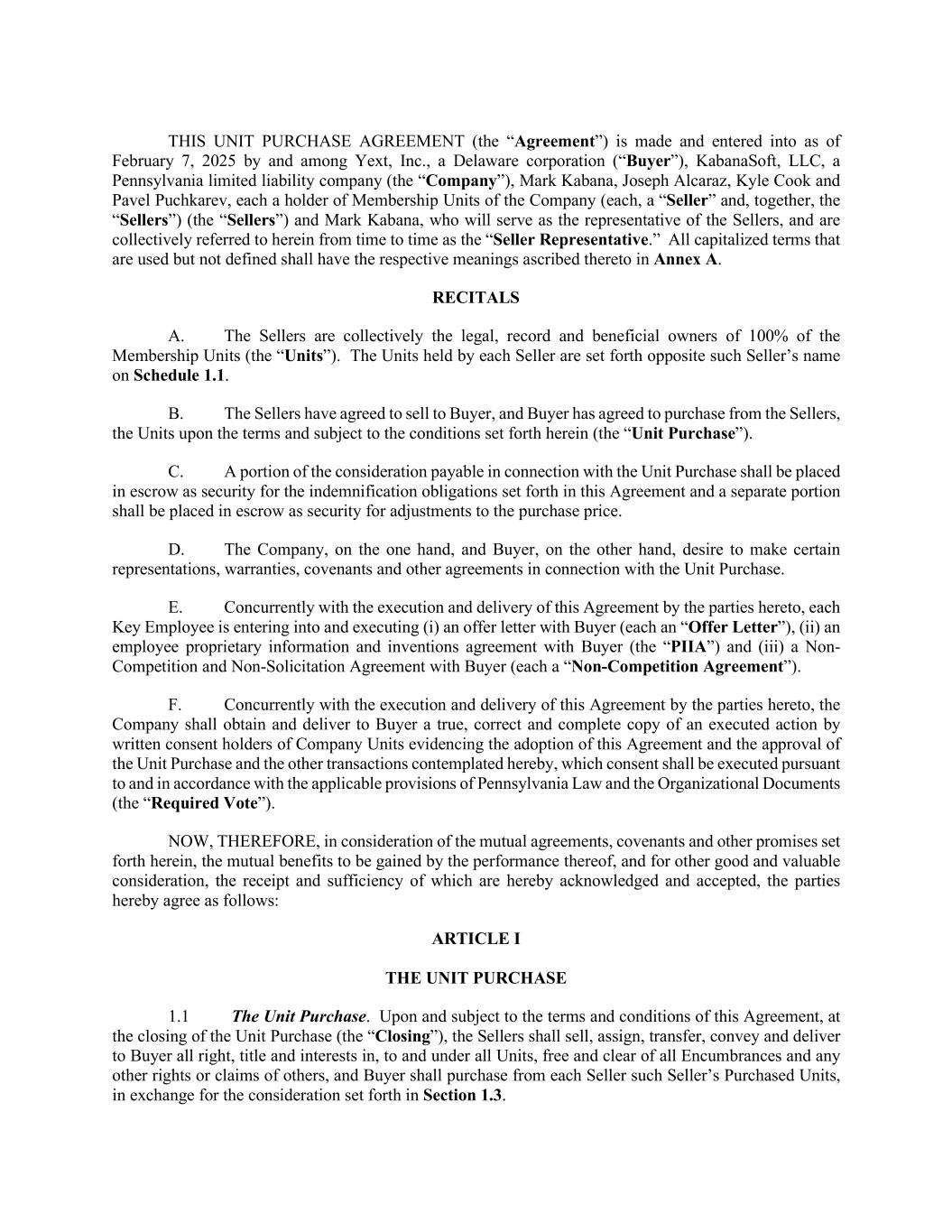 THIS UNIT PURCHASE AGREEMENT (the “Agreement”) is made and entered into as of February 7, 2025 by and among Yext, Inc., a Delaware corporation (“Buyer”), KabanaSoft, LLC, a Pennsylvania limited liability company (the “Company”), Mark Kabana, Joseph Alcaraz, Kyle Cook and Pavel Puchkarev, each a holder of Membership Units of the Company (each, a “Seller” and, together, the “Sellers”) (the “Sellers”) and Mark Kabana, who will serve as the representative of the Sellers, and are collectively referred to herein from time to time as the “Seller Representative.” All capitalized terms that are used but not defined shall have the respective meanings ascribed thereto in Annex A. RECITALS A. The Sellers are collectively the legal, record and beneficial owners of 100% of the Membership Units (the “Units”). The Units held by each Seller are set forth opposite such Seller’s name on Schedule 1.1. B. The Sellers have agreed to sell to Buyer, and Buyer has agreed to purchase from the Sellers, the Units upon the terms and subject to the conditions set forth herein (the “Unit Purchase”). C. A portion of the consideration payable in connection with the Unit Purchase shall be placed in escrow as security for the indemnification obligations set forth in this Agreement and a separate portion shall be placed in escrow as security for adjustments to the purchase price. D. The Company, on the one hand, and Buyer, on the other hand, desire to make certain representations, warranties, covenants and other agreements in connection with the Unit Purchase. E. Concurrently with the execution and delivery of this Agreement by the parties hereto, each Key Employee is entering into and executing (i) an offer letter with Buyer (each an “Offer Letter”), (ii) an employee proprietary information and inventions agreement with Buyer (the “PIIA”) and (iii) a Non- Competition and Non-Solicitation Agreement with Buyer (each a “Non-Competition Agreement”). F. Concurrently with the execution and delivery of this Agreement by the parties hereto, the Company shall obtain and deliver to Buyer a true, correct and complete copy of an executed action by written consent holders of Company Units evidencing the adoption of this Agreement and the approval of the Unit Purchase and the other transactions contemplated hereby, which consent shall be executed pursuant to and in accordance with the applicable provisions of Pennsylvania Law and the Organizational Documents (the “Required Vote”). NOW, THEREFORE, in consideration of the mutual agreements, covenants and other promises set forth herein, the mutual benefits to be gained by the performance thereof, and for other good and valuable consideration, the receipt and sufficiency of which are hereby acknowledged and accepted, the parties hereby agree as follows: ARTICLE I THE UNIT PURCHASE 1.1 The Unit Purchase. Upon and subject to the terms and conditions of this Agreement, at the closing of the Unit Purchase (the “Closing”), the Sellers shall sell, assign, transfer, convey and deliver to Buyer all right, title and interests in, to and under all Units, free and clear of all Encumbrances and any other rights or claims of others, and Buyer shall purchase from each Seller such Seller’s Purchased Units, in exchange for the consideration set forth in Section 1.3.