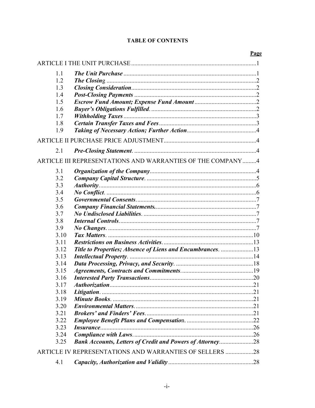 -i- TABLE OF CONTENTS Page ARTICLE I THE UNIT PURCHASE .................................................................................1 1.1 The Unit Purchase ......................................................................................1 1.2 The Closing .................................................................................................2 1.3 Closing Consideration.................................................................................2 1.4 Post-Closing Payments ...............................................................................2 1.5 Escrow Fund Amount; Expense Fund Amount ........................................2 1.6 Buyer’s Obligations Fulfilled. ....................................................................2 1.7 Withholding Taxes ......................................................................................3 1.8 Certain Transfer Taxes and Fees ...............................................................3 1.9 Taking of Necessary Action; Further Action.............................................4 ARTICLE II PURCHASE PRICE ADJUSTMENT............................................................4 2.1 Pre-Closing Statement. ...............................................................................4 ARTICLE III REPRESENTATIONS AND WARRANTIES OF THE COMPANY .........4 3.1 Organization of the Company.....................................................................4 3.2 Company Capital Structure. .......................................................................5 3.3 Authority. .....................................................................................................6 3.4 No Conflict. .................................................................................................6 3.5 Governmental Consents. .............................................................................7 3.6 Company Financial Statements..................................................................7 3.7 No Undisclosed Liabilities. .........................................................................7 3.8 Internal Controls. ........................................................................................7 3.9 No Changes. ................................................................................................7 3.10 Tax Matters. ..............................................................................................10 3.11 Restrictions on Business Activities. ..........................................................13 3.12 Title to Properties; Absence of Liens and Encumbrances. .....................13 3.13 Intellectual Property. ................................................................................14 3.14 Data Processing, Privacy, and Security. ..................................................18 3.15 Agreements, Contracts and Commitments. ..............................................19 3.16 Interested Party Transactions. ..................................................................20 3.17 Authorization. ............................................................................................21 3.18 Litigation. ..................................................................................................21 3.19 Minute Books. ...........................................................................................21 3.20 Environmental Matters. ............................................................................21 3.21 Brokers’ and Finders’ Fees. .....................................................................21 3.22 Employee Benefit Plans and Compensation. ...........................................22 3.23 Insurance. ..................................................................................................26 3.24 Compliance with Laws. .............................................................................26 3.25 Bank Accounts, Letters of Credit and Powers of Attorney. .....................28 ARTICLE IV REPRESENTATIONS AND WARRANTIES OF SELLERS ..................28 4.1 Capacity, Authorization and Validity .......................................................28