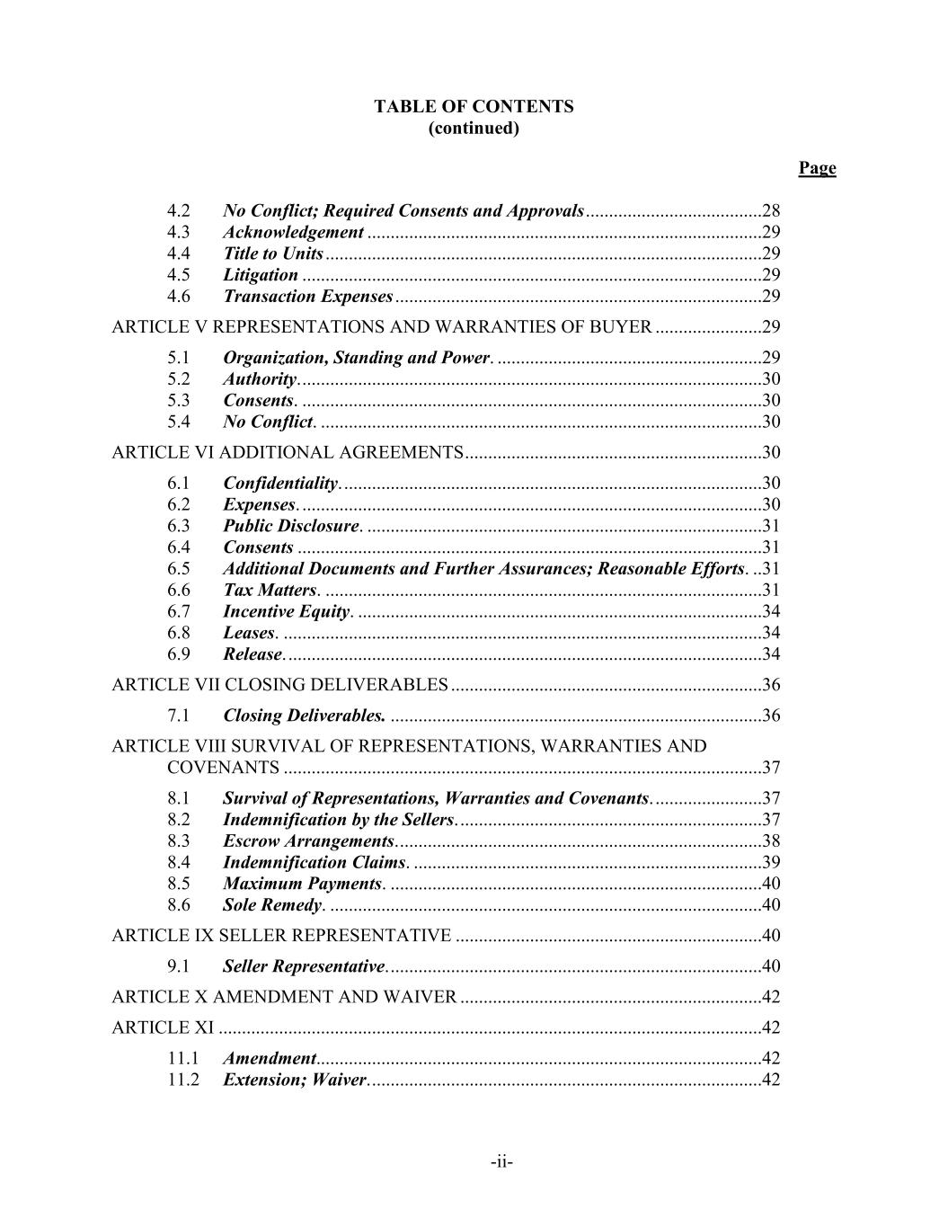 TABLE OF CONTENTS (continued) Page -ii- 4.2 No Conflict; Required Consents and Approvals ......................................28 4.3 Acknowledgement .....................................................................................29 4.4 Title to Units ..............................................................................................29 4.5 Litigation ...................................................................................................29 4.6 Transaction Expenses ...............................................................................29 ARTICLE V REPRESENTATIONS AND WARRANTIES OF BUYER .......................29 5.1 Organization, Standing and Power. .........................................................29 5.2 Authority. ...................................................................................................30 5.3 Consents. ...................................................................................................30 5.4 No Conflict. ...............................................................................................30 ARTICLE VI ADDITIONAL AGREEMENTS ................................................................30 6.1 Confidentiality. ..........................................................................................30 6.2 Expenses. ...................................................................................................30 6.3 Public Disclosure. .....................................................................................31 6.4 Consents ....................................................................................................31 6.5 Additional Documents and Further Assurances; Reasonable Efforts. ..31 6.6 Tax Matters. ..............................................................................................31 6.7 Incentive Equity. .......................................................................................34 6.8 Leases. .......................................................................................................34 6.9 Release. ......................................................................................................34 ARTICLE VII CLOSING DELIVERABLES ...................................................................36 7.1 Closing Deliverables. ................................................................................36 ARTICLE VIII SURVIVAL OF REPRESENTATIONS, WARRANTIES AND COVENANTS .......................................................................................................37 8.1 Survival of Representations, Warranties and Covenants. .......................37 8.2 Indemnification by the Sellers. .................................................................37 8.3 Escrow Arrangements. ..............................................................................38 8.4 Indemnification Claims. ...........................................................................39 8.5 Maximum Payments. ................................................................................40 8.6 Sole Remedy. .............................................................................................40 ARTICLE IX SELLER REPRESENTATIVE ..................................................................40 9.1 Seller Representative. ................................................................................40 ARTICLE X AMENDMENT AND WAIVER .................................................................42 ARTICLE XI .....................................................................................................................42 11.1 Amendment................................................................................................42 11.2 Extension; Waiver. ....................................................................................42