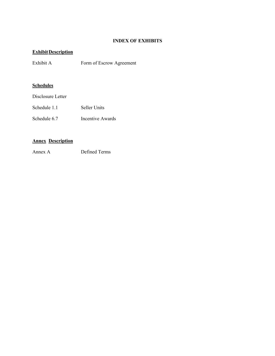 INDEX OF EXHIBITS Exhibit Description Exhibit A Form of Escrow Agreement Schedules Disclosure Letter Schedule 1.1 Seller Units Schedule 6.7 Incentive Awards Annex Description Annex A Defined Terms