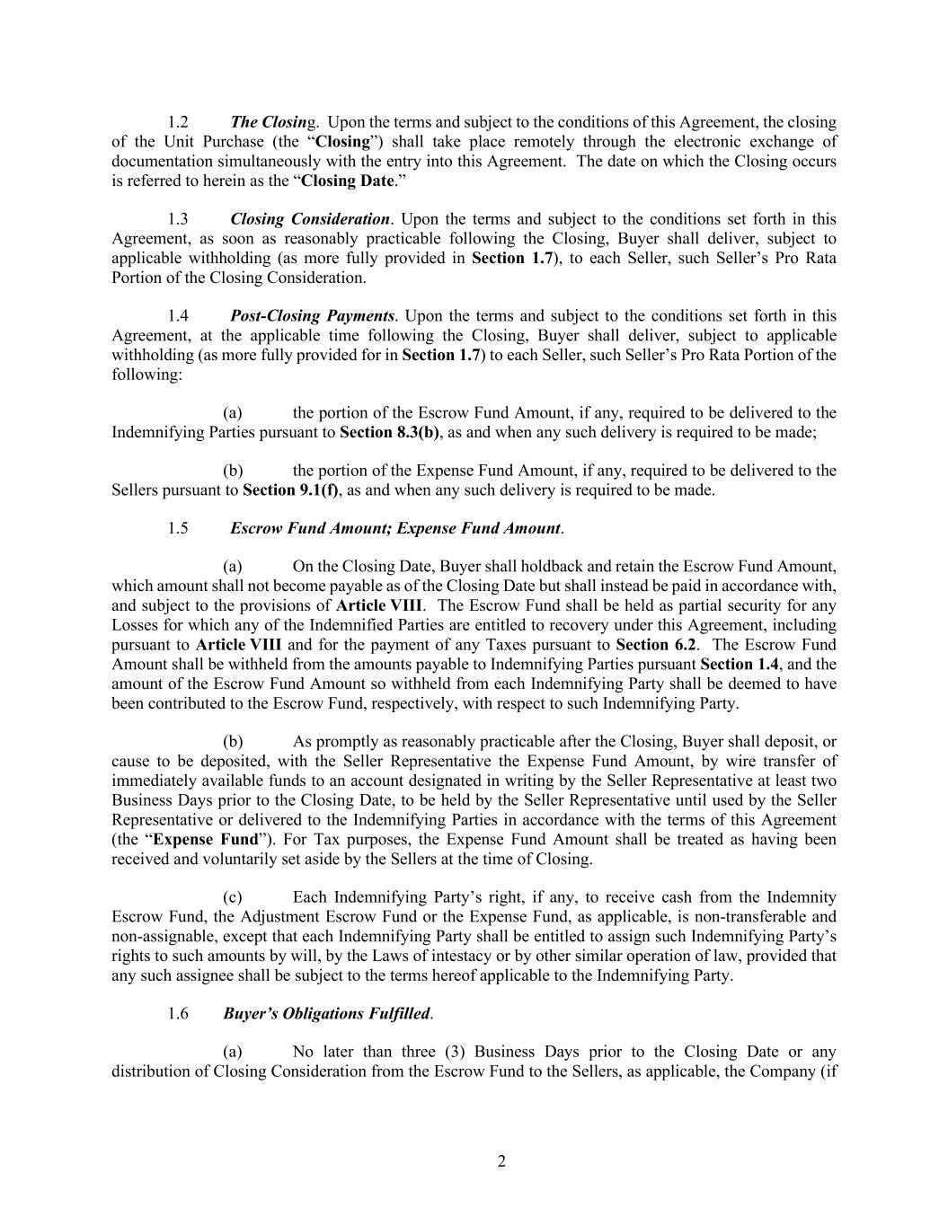 2 1.2 The Closing. Upon the terms and subject to the conditions of this Agreement, the closing of the Unit Purchase (the “Closing”) shall take place remotely through the electronic exchange of documentation simultaneously with the entry into this Agreement. The date on which the Closing occurs is referred to herein as the “Closing Date.” 1.3 Closing Consideration. Upon the terms and subject to the conditions set forth in this Agreement, as soon as reasonably practicable following the Closing, Buyer shall deliver, subject to applicable withholding (as more fully provided in Section 1.7), to each Seller, such Seller’s Pro Rata Portion of the Closing Consideration. 1.4 Post-Closing Payments. Upon the terms and subject to the conditions set forth in this Agreement, at the applicable time following the Closing, Buyer shall deliver, subject to applicable withholding (as more fully provided for in Section 1.7) to each Seller, such Seller’s Pro Rata Portion of the following: (a) the portion of the Escrow Fund Amount, if any, required to be delivered to the Indemnifying Parties pursuant to Section 8.3(b), as and when any such delivery is required to be made; (b) the portion of the Expense Fund Amount, if any, required to be delivered to the Sellers pursuant to Section 9.1(f), as and when any such delivery is required to be made. 1.5 Escrow Fund Amount; Expense Fund Amount. (a) On the Closing Date, Buyer shall holdback and retain the Escrow Fund Amount, which amount shall not become payable as of the Closing Date but shall instead be paid in accordance with, and subject to the provisions of Article VIII. The Escrow Fund shall be held as partial security for any Losses for which any of the Indemnified Parties are entitled to recovery under this Agreement, including pursuant to Article VIII and for the payment of any Taxes pursuant to Section 6.2. The Escrow Fund Amount shall be withheld from the amounts payable to Indemnifying Parties pursuant Section 1.4, and the amount of the Escrow Fund Amount so withheld from each Indemnifying Party shall be deemed to have been contributed to the Escrow Fund, respectively, with respect to such Indemnifying Party. (b) As promptly as reasonably practicable after the Closing, Buyer shall deposit, or cause to be deposited, with the Seller Representative the Expense Fund Amount, by wire transfer of immediately available funds to an account designated in writing by the Seller Representative at least two Business Days prior to the Closing Date, to be held by the Seller Representative until used by the Seller Representative or delivered to the Indemnifying Parties in accordance with the terms of this Agreement (the “Expense Fund”). For Tax purposes, the Expense Fund Amount shall be treated as having been received and voluntarily set aside by the Sellers at the time of Closing. (c) Each Indemnifying Party’s right, if any, to receive cash from the Indemnity Escrow Fund, the Adjustment Escrow Fund or the Expense Fund, as applicable, is non-transferable and non-assignable, except that each Indemnifying Party shall be entitled to assign such Indemnifying Party’s rights to such amounts by will, by the Laws of intestacy or by other similar operation of law, provided that any such assignee shall be subject to the terms hereof applicable to the Indemnifying Party. 1.6 Buyer’s Obligations Fulfilled. (a) No later than three (3) Business Days prior to the Closing Date or any distribution of Closing Consideration from the Escrow Fund to the Sellers, as applicable, the Company (if