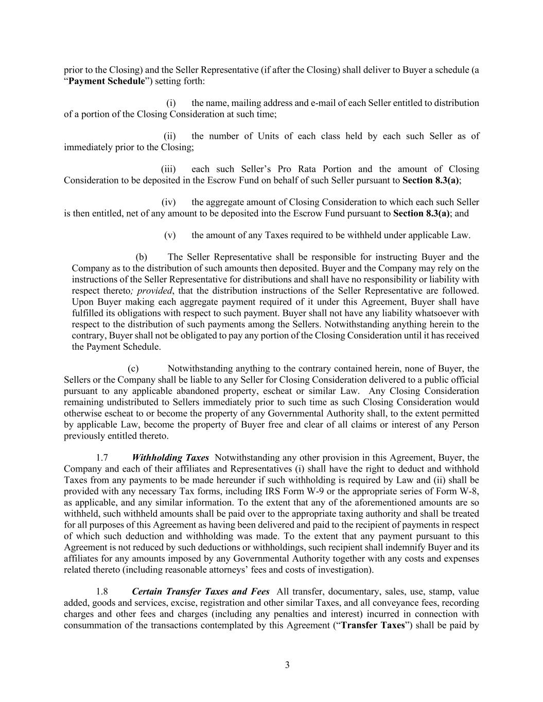 3 prior to the Closing) and the Seller Representative (if after the Closing) shall deliver to Buyer a schedule (a “Payment Schedule”) setting forth: (i) the name, mailing address and e-mail of each Seller entitled to distribution of a portion of the Closing Consideration at such time; (ii) the number of Units of each class held by each such Seller as of immediately prior to the Closing; (iii) each such Seller’s Pro Rata Portion and the amount of Closing Consideration to be deposited in the Escrow Fund on behalf of such Seller pursuant to Section 8.3(a); (iv) the aggregate amount of Closing Consideration to which each such Seller is then entitled, net of any amount to be deposited into the Escrow Fund pursuant to Section 8.3(a); and (v) the amount of any Taxes required to be withheld under applicable Law. (b) The Seller Representative shall be responsible for instructing Buyer and the Company as to the distribution of such amounts then deposited. Buyer and the Company may rely on the instructions of the Seller Representative for distributions and shall have no responsibility or liability with respect thereto; provided, that the distribution instructions of the Seller Representative are followed. Upon Buyer making each aggregate payment required of it under this Agreement, Buyer shall have fulfilled its obligations with respect to such payment. Buyer shall not have any liability whatsoever with respect to the distribution of such payments among the Sellers. Notwithstanding anything herein to the contrary, Buyer shall not be obligated to pay any portion of the Closing Consideration until it has received the Payment Schedule. (c) Notwithstanding anything to the contrary contained herein, none of Buyer, the Sellers or the Company shall be liable to any Seller for Closing Consideration delivered to a public official pursuant to any applicable abandoned property, escheat or similar Law. Any Closing Consideration remaining undistributed to Sellers immediately prior to such time as such Closing Consideration would otherwise escheat to or become the property of any Governmental Authority shall, to the extent permitted by applicable Law, become the property of Buyer free and clear of all claims or interest of any Person previously entitled thereto. 1.7 Withholding Taxes Notwithstanding any other provision in this Agreement, Buyer, the Company and each of their affiliates and Representatives (i) shall have the right to deduct and withhold Taxes from any payments to be made hereunder if such withholding is required by Law and (ii) shall be provided with any necessary Tax forms, including IRS Form W-9 or the appropriate series of Form W-8, as applicable, and any similar information. To the extent that any of the aforementioned amounts are so withheld, such withheld amounts shall be paid over to the appropriate taxing authority and shall be treated for all purposes of this Agreement as having been delivered and paid to the recipient of payments in respect of which such deduction and withholding was made. To the extent that any payment pursuant to this Agreement is not reduced by such deductions or withholdings, such recipient shall indemnify Buyer and its affiliates for any amounts imposed by any Governmental Authority together with any costs and expenses related thereto (including reasonable attorneys’ fees and costs of investigation). 1.8 Certain Transfer Taxes and Fees All transfer, documentary, sales, use, stamp, value added, goods and services, excise, registration and other similar Taxes, and all conveyance fees, recording charges and other fees and charges (including any penalties and interest) incurred in connection with consummation of the transactions contemplated by this Agreement (“Transfer Taxes”) shall be paid by