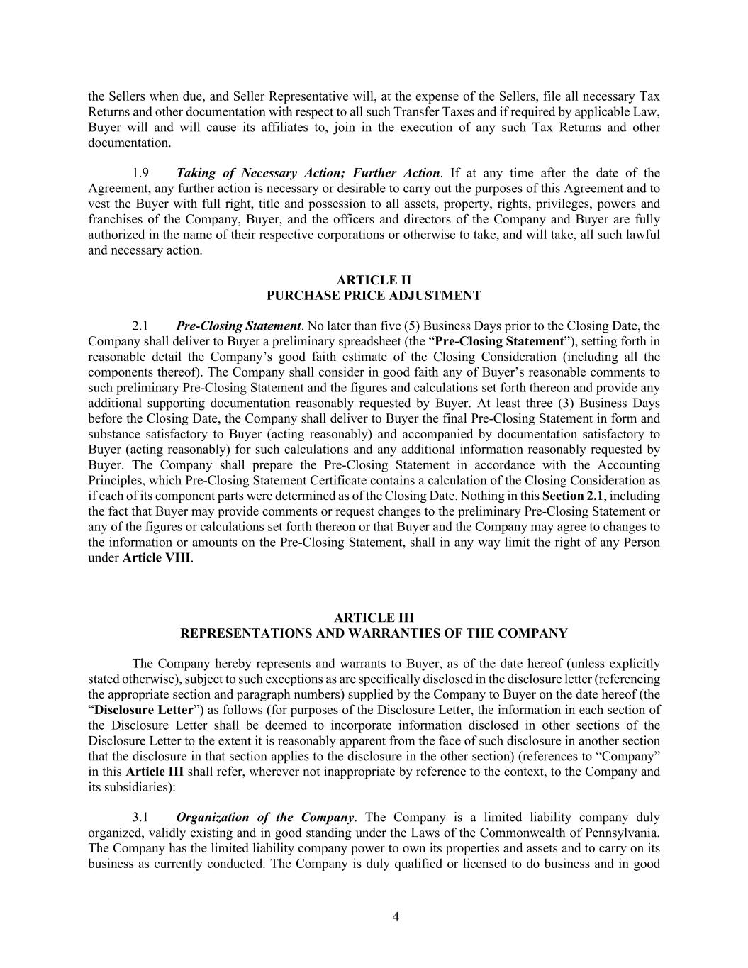 4 the Sellers when due, and Seller Representative will, at the expense of the Sellers, file all necessary Tax Returns and other documentation with respect to all such Transfer Taxes and if required by applicable Law, Buyer will and will cause its affiliates to, join in the execution of any such Tax Returns and other documentation. 1.9 Taking of Necessary Action; Further Action. If at any time after the date of the Agreement, any further action is necessary or desirable to carry out the purposes of this Agreement and to vest the Buyer with full right, title and possession to all assets, property, rights, privileges, powers and franchises of the Company, Buyer, and the officers and directors of the Company and Buyer are fully authorized in the name of their respective corporations or otherwise to take, and will take, all such lawful and necessary action. ARTICLE II PURCHASE PRICE ADJUSTMENT 2.1 Pre-Closing Statement. No later than five (5) Business Days prior to the Closing Date, the Company shall deliver to Buyer a preliminary spreadsheet (the “Pre-Closing Statement”), setting forth in reasonable detail the Company’s good faith estimate of the Closing Consideration (including all the components thereof). The Company shall consider in good faith any of Buyer’s reasonable comments to such preliminary Pre-Closing Statement and the figures and calculations set forth thereon and provide any additional supporting documentation reasonably requested by Buyer. At least three (3) Business Days before the Closing Date, the Company shall deliver to Buyer the final Pre-Closing Statement in form and substance satisfactory to Buyer (acting reasonably) and accompanied by documentation satisfactory to Buyer (acting reasonably) for such calculations and any additional information reasonably requested by Buyer. The Company shall prepare the Pre-Closing Statement in accordance with the Accounting Principles, which Pre-Closing Statement Certificate contains a calculation of the Closing Consideration as if each of its component parts were determined as of the Closing Date. Nothing in this Section 2.1, including the fact that Buyer may provide comments or request changes to the preliminary Pre-Closing Statement or any of the figures or calculations set forth thereon or that Buyer and the Company may agree to changes to the information or amounts on the Pre-Closing Statement, shall in any way limit the right of any Person under Article VIII. ARTICLE III REPRESENTATIONS AND WARRANTIES OF THE COMPANY The Company hereby represents and warrants to Buyer, as of the date hereof (unless explicitly stated otherwise), subject to such exceptions as are specifically disclosed in the disclosure letter (referencing the appropriate section and paragraph numbers) supplied by the Company to Buyer on the date hereof (the “Disclosure Letter”) as follows (for purposes of the Disclosure Letter, the information in each section of the Disclosure Letter shall be deemed to incorporate information disclosed in other sections of the Disclosure Letter to the extent it is reasonably apparent from the face of such disclosure in another section that the disclosure in that section applies to the disclosure in the other section) (references to “Company” in this Article III shall refer, wherever not inappropriate by reference to the context, to the Company and its subsidiaries): 3.1 Organization of the Company. The Company is a limited liability company duly organized, validly existing and in good standing under the Laws of the Commonwealth of Pennsylvania. The Company has the limited liability company power to own its properties and assets and to carry on its business as currently conducted. The Company is duly qualified or licensed to do business and in good