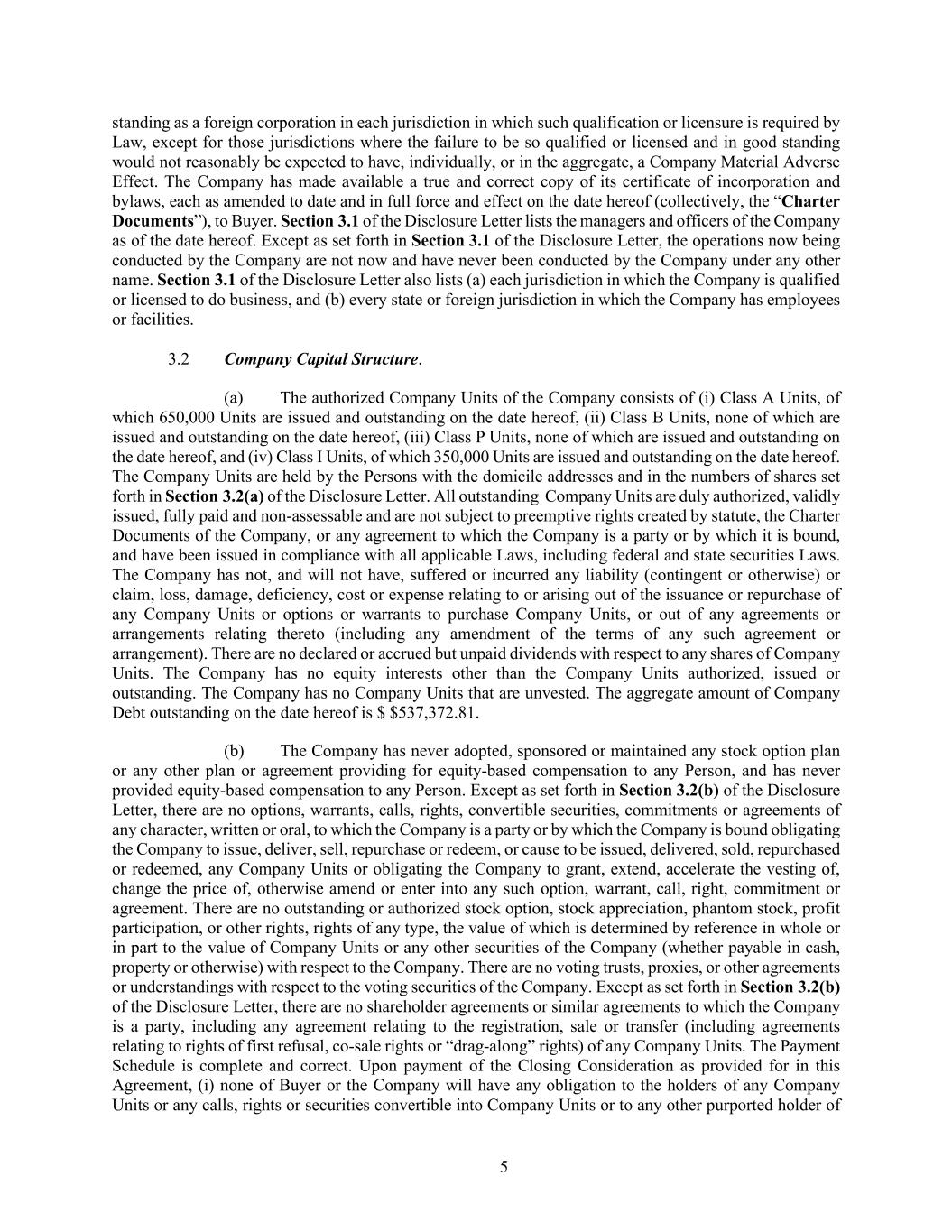 5 standing as a foreign corporation in each jurisdiction in which such qualification or licensure is required by Law, except for those jurisdictions where the failure to be so qualified or licensed and in good standing would not reasonably be expected to have, individually, or in the aggregate, a Company Material Adverse Effect. The Company has made available a true and correct copy of its certificate of incorporation and bylaws, each as amended to date and in full force and effect on the date hereof (collectively, the “Charter Documents”), to Buyer. Section 3.1 of the Disclosure Letter lists the managers and officers of the Company as of the date hereof. Except as set forth in Section 3.1 of the Disclosure Letter, the operations now being conducted by the Company are not now and have never been conducted by the Company under any other name. Section 3.1 of the Disclosure Letter also lists (a) each jurisdiction in which the Company is qualified or licensed to do business, and (b) every state or foreign jurisdiction in which the Company has employees or facilities. 3.2 Company Capital Structure. (a) The authorized Company Units of the Company consists of (i) Class A Units, of which 650,000 Units are issued and outstanding on the date hereof, (ii) Class B Units, none of which are issued and outstanding on the date hereof, (iii) Class P Units, none of which are issued and outstanding on the date hereof, and (iv) Class I Units, of which 350,000 Units are issued and outstanding on the date hereof. The Company Units are held by the Persons with the domicile addresses and in the numbers of shares set forth in Section 3.2(a) of the Disclosure Letter. All outstanding Company Units are duly authorized, validly issued, fully paid and non-assessable and are not subject to preemptive rights created by statute, the Charter Documents of the Company, or any agreement to which the Company is a party or by which it is bound, and have been issued in compliance with all applicable Laws, including federal and state securities Laws. The Company has not, and will not have, suffered or incurred any liability (contingent or otherwise) or claim, loss, damage, deficiency, cost or expense relating to or arising out of the issuance or repurchase of any Company Units or options or warrants to purchase Company Units, or out of any agreements or arrangements relating thereto (including any amendment of the terms of any such agreement or arrangement). There are no declared or accrued but unpaid dividends with respect to any shares of Company Units. The Company has no equity interests other than the Company Units authorized, issued or outstanding. The Company has no Company Units that are unvested. The aggregate amount of Company Debt outstanding on the date hereof is $ $537,372.81. (b) The Company has never adopted, sponsored or maintained any stock option plan or any other plan or agreement providing for equity-based compensation to any Person, and has never provided equity-based compensation to any Person. Except as set forth in Section 3.2(b) of the Disclosure Letter, there are no options, warrants, calls, rights, convertible securities, commitments or agreements of any character, written or oral, to which the Company is a party or by which the Company is bound obligating the Company to issue, deliver, sell, repurchase or redeem, or cause to be issued, delivered, sold, repurchased or redeemed, any Company Units or obligating the Company to grant, extend, accelerate the vesting of, change the price of, otherwise amend or enter into any such option, warrant, call, right, commitment or agreement. There are no outstanding or authorized stock option, stock appreciation, phantom stock, profit participation, or other rights, rights of any type, the value of which is determined by reference in whole or in part to the value of Company Units or any other securities of the Company (whether payable in cash, property or otherwise) with respect to the Company. There are no voting trusts, proxies, or other agreements or understandings with respect to the voting securities of the Company. Except as set forth in Section 3.2(b) of the Disclosure Letter, there are no shareholder agreements or similar agreements to which the Company is a party, including any agreement relating to the registration, sale or transfer (including agreements relating to rights of first refusal, co-sale rights or “drag-along” rights) of any Company Units. The Payment Schedule is complete and correct. Upon payment of the Closing Consideration as provided for in this Agreement, (i) none of Buyer or the Company will have any obligation to the holders of any Company Units or any calls, rights or securities convertible into Company Units or to any other purported holder of