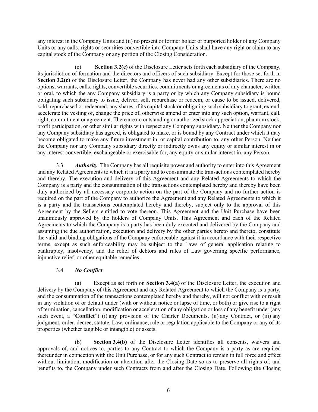 6 any interest in the Company Units and (ii) no present or former holder or purported holder of any Company Units or any calls, rights or securities convertible into Company Units shall have any right or claim to any capital stock of the Company or any portion of the Closing Consideration. (c) Section 3.2(c) of the Disclosure Letter sets forth each subsidiary of the Company, its jurisdiction of formation and the directors and officers of such subsidiary. Except for those set forth in Section 3.2(c) of the Disclosure Letter, the Company has never had any other subsidiaries. There are no options, warrants, calls, rights, convertible securities, commitments or agreements of any character, written or oral, to which the any Company subsidiary is a party or by which any Company subsidiary is bound obligating such subsidiary to issue, deliver, sell, repurchase or redeem, or cause to be issued, delivered, sold, repurchased or redeemed, any shares of its capital stock or obligating such subsidiary to grant, extend, accelerate the vesting of, change the price of, otherwise amend or enter into any such option, warrant, call, right, commitment or agreement. There are no outstanding or authorized stock appreciation, phantom stock, profit participation, or other similar rights with respect any Company subsidiary. Neither the Company nor any Company subsidiary has agreed, is obligated to make, or is bound by any Contract under which it may become obligated to make any future investment in, or capital contribution to, any other Person. Neither the Company nor any Company subsidiary directly or indirectly owns any equity or similar interest in or any interest convertible, exchangeable or exercisable for, any equity or similar interest in, any Person. 3.3 Authority. The Company has all requisite power and authority to enter into this Agreement and any Related Agreements to which it is a party and to consummate the transactions contemplated hereby and thereby. The execution and delivery of this Agreement and any Related Agreements to which the Company is a party and the consummation of the transactions contemplated hereby and thereby have been duly authorized by all necessary corporate action on the part of the Company and no further action is required on the part of the Company to authorize the Agreement and any Related Agreements to which it is a party and the transactions contemplated hereby and thereby, subject only to the approval of this Agreement by the Sellers entitled to vote thereon. This Agreement and the Unit Purchase have been unanimously approved by the holders of Company Units. This Agreement and each of the Related Agreements to which the Company is a party has been duly executed and delivered by the Company and assuming the due authorization, execution and delivery by the other parties hereto and thereto, constitute the valid and binding obligations of the Company enforceable against it in accordance with their respective terms, except as such enforceability may be subject to the Laws of general application relating to bankruptcy, insolvency, and the relief of debtors and rules of Law governing specific performance, injunctive relief, or other equitable remedies. 3.4 No Conflict. (a) Except as set forth on Section 3.4(a) of the Disclosure Letter, the execution and delivery by the Company of this Agreement and any Related Agreement to which the Company is a party, and the consummation of the transactions contemplated hereby and thereby, will not conflict with or result in any violation of or default under (with or without notice or lapse of time, or both) or give rise to a right of termination, cancellation, modification or acceleration of any obligation or loss of any benefit under (any such event, a “Conflict”) (i) any provision of the Charter Documents, (ii) any Contract, or (iii) any judgment, order, decree, statute, Law, ordinance, rule or regulation applicable to the Company or any of its properties (whether tangible or intangible) or assets. (b) Section 3.4(b) of the Disclosure Letter identifies all consents, waivers and approvals of, and notices to, parties to any Contract to which the Company is a party as are required thereunder in connection with the Unit Purchase, or for any such Contract to remain in full force and effect without limitation, modification or alteration after the Closing Date so as to preserve all rights of, and benefits to, the Company under such Contracts from and after the Closing Date. Following the Closing