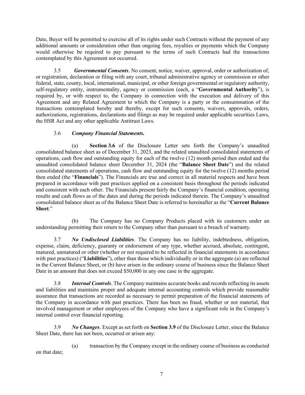 7 Date, Buyer will be permitted to exercise all of its rights under such Contracts without the payment of any additional amounts or consideration other than ongoing fees, royalties or payments which the Company would otherwise be required to pay pursuant to the terms of such Contracts had the transactions contemplated by this Agreement not occurred. 3.5 Governmental Consents. No consent, notice, waiver, approval, order or authorization of, or registration, declaration or filing with any court, tribunal administrative agency or commission or other federal, state, county, local, international, municipal, or other foreign governmental or regulatory authority, self-regulatory entity, instrumentality, agency or commission (each, a “Governmental Authority”), is required by, or with respect to, the Company in connection with the execution and delivery of this Agreement and any Related Agreement to which the Company is a party or the consummation of the transactions contemplated hereby and thereby, except for such consents, waivers, approvals, orders, authorizations, registrations, declarations and filings as may be required under applicable securities Laws, the HSR Act and any other applicable Antitrust Laws. 3.6 Company Financial Statements. (a) Section 3.6 of the Disclosure Letter sets forth the Company’s unaudited consolidated balance sheet as of December 31, 2023, and the related unaudited consolidated statements of operations, cash flow and outstanding equity for each of the twelve (12) month period then ended and the unaudited consolidated balance sheet December 31, 2024 (the “Balance Sheet Date”) and the related consolidated statements of operations, cash flow and outstanding equity for the twelve (12) months period then ended (the “Financials”). The Financials are true and correct in all material respects and have been prepared in accordance with past practices applied on a consistent basis throughout the periods indicated and consistent with each other. The Financials present fairly the Company’s financial condition, operating results and cash flows as of the dates and during the periods indicated therein. The Company’s unaudited consolidated balance sheet as of the Balance Sheet Date is referred to hereinafter as the “Current Balance Sheet.” (b) The Company has no Company Products placed with its customers under an understanding permitting their return to the Company other than pursuant to a breach of warranty. 3.7 No Undisclosed Liabilities. The Company has no liability, indebtedness, obligation, expense, claim, deficiency, guaranty or endorsement of any type, whether accrued, absolute, contingent, matured, unmatured or other (whether or not required to be reflected in financial statements in accordance with past practices) (“Liabilities”), other than those which individually or in the aggregate (a) are reflected in the Current Balance Sheet, or (b) have arisen in the ordinary course of business since the Balance Sheet Date in an amount that does not exceed $50,000 in any one case in the aggregate. 3.8 Internal Controls. The Company maintains accurate books and records reflecting its assets and liabilities and maintains proper and adequate internal accounting controls which provide reasonable assurance that transactions are recorded as necessary to permit preparation of the financial statements of the Company in accordance with past practices. There has been no fraud, whether or not material, that involved management or other employees of the Company who have a significant role in the Company’s internal control over financial reporting. 3.9 No Changes. Except as set forth on Section 3.9 of the Disclosure Letter, since the Balance Sheet Date, there has not been, occurred or arisen any: (a) transaction by the Company except in the ordinary course of business as conducted on that date;