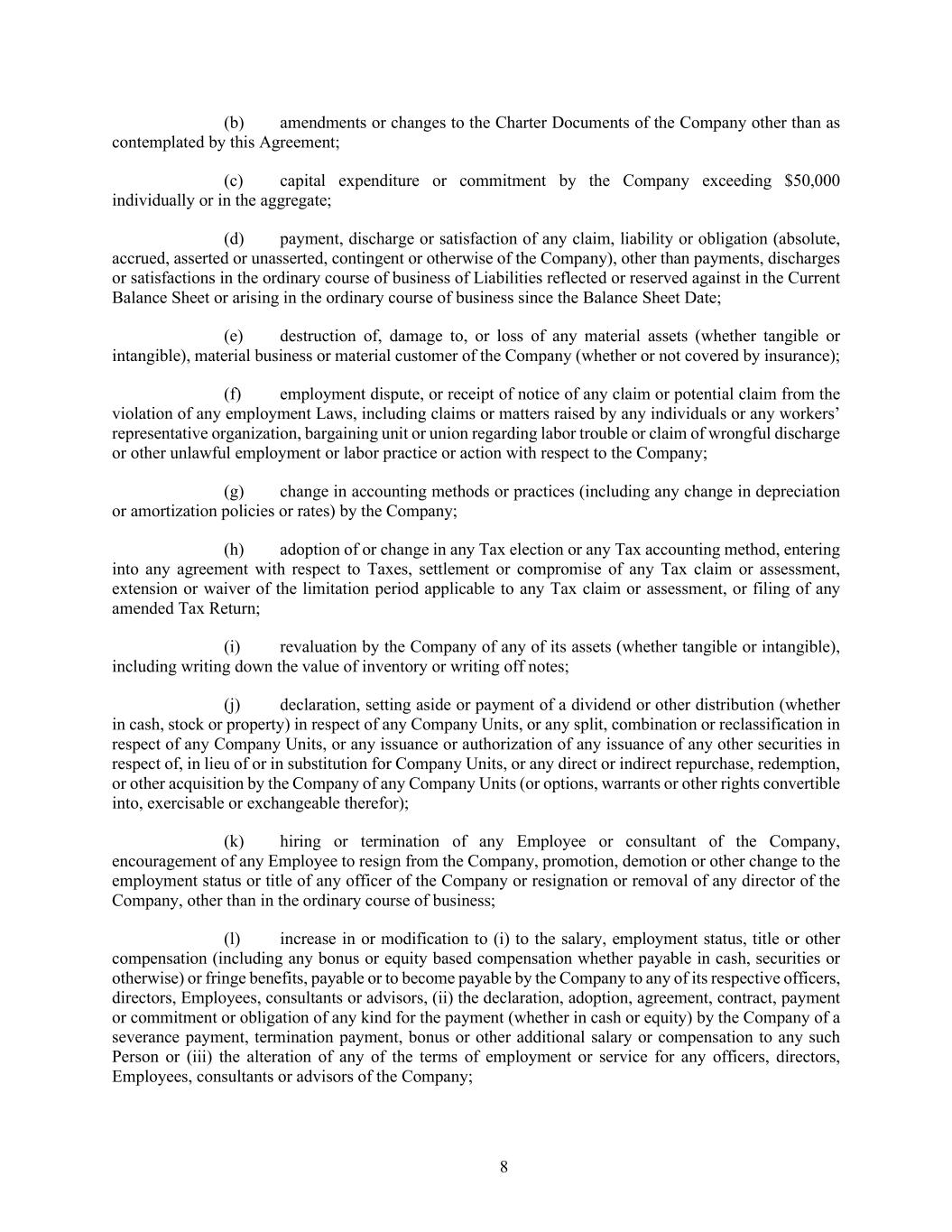 8 (b) amendments or changes to the Charter Documents of the Company other than as contemplated by this Agreement; (c) capital expenditure or commitment by the Company exceeding $50,000 individually or in the aggregate; (d) payment, discharge or satisfaction of any claim, liability or obligation (absolute, accrued, asserted or unasserted, contingent or otherwise of the Company), other than payments, discharges or satisfactions in the ordinary course of business of Liabilities reflected or reserved against in the Current Balance Sheet or arising in the ordinary course of business since the Balance Sheet Date; (e) destruction of, damage to, or loss of any material assets (whether tangible or intangible), material business or material customer of the Company (whether or not covered by insurance); (f) employment dispute, or receipt of notice of any claim or potential claim from the violation of any employment Laws, including claims or matters raised by any individuals or any workers’ representative organization, bargaining unit or union regarding labor trouble or claim of wrongful discharge or other unlawful employment or labor practice or action with respect to the Company; (g) change in accounting methods or practices (including any change in depreciation or amortization policies or rates) by the Company; (h) adoption of or change in any Tax election or any Tax accounting method, entering into any agreement with respect to Taxes, settlement or compromise of any Tax claim or assessment, extension or waiver of the limitation period applicable to any Tax claim or assessment, or filing of any amended Tax Return; (i) revaluation by the Company of any of its assets (whether tangible or intangible), including writing down the value of inventory or writing off notes; (j) declaration, setting aside or payment of a dividend or other distribution (whether in cash, stock or property) in respect of any Company Units, or any split, combination or reclassification in respect of any Company Units, or any issuance or authorization of any issuance of any other securities in respect of, in lieu of or in substitution for Company Units, or any direct or indirect repurchase, redemption, or other acquisition by the Company of any Company Units (or options, warrants or other rights convertible into, exercisable or exchangeable therefor); (k) hiring or termination of any Employee or consultant of the Company, encouragement of any Employee to resign from the Company, promotion, demotion or other change to the employment status or title of any officer of the Company or resignation or removal of any director of the Company, other than in the ordinary course of business; (l) increase in or modification to (i) to the salary, employment status, title or other compensation (including any bonus or equity based compensation whether payable in cash, securities or otherwise) or fringe benefits, payable or to become payable by the Company to any of its respective officers, directors, Employees, consultants or advisors, (ii) the declaration, adoption, agreement, contract, payment or commitment or obligation of any kind for the payment (whether in cash or equity) by the Company of a severance payment, termination payment, bonus or other additional salary or compensation to any such Person or (iii) the alteration of any of the terms of employment or service for any officers, directors, Employees, consultants or advisors of the Company;