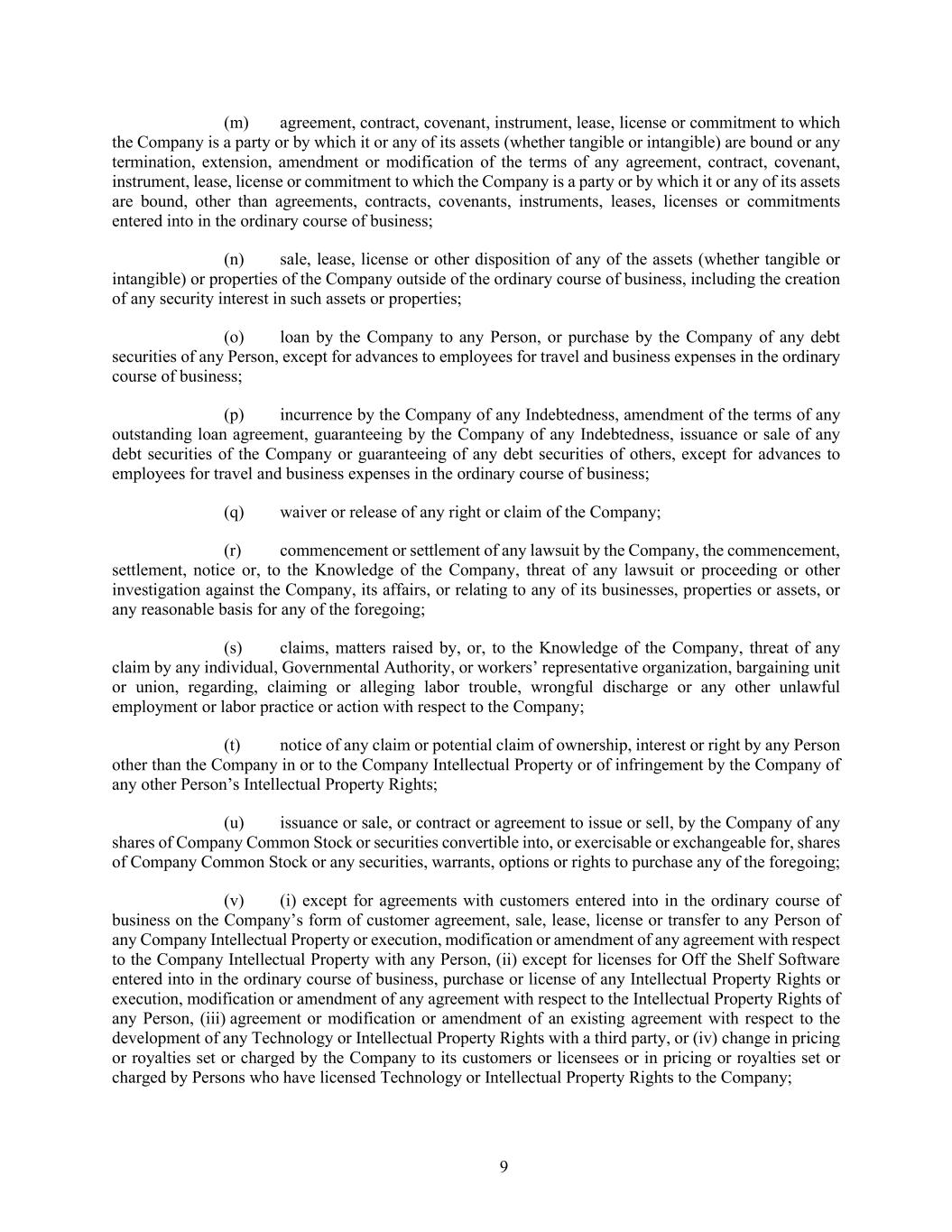 9 (m) agreement, contract, covenant, instrument, lease, license or commitment to which the Company is a party or by which it or any of its assets (whether tangible or intangible) are bound or any termination, extension, amendment or modification of the terms of any agreement, contract, covenant, instrument, lease, license or commitment to which the Company is a party or by which it or any of its assets are bound, other than agreements, contracts, covenants, instruments, leases, licenses or commitments entered into in the ordinary course of business; (n) sale, lease, license or other disposition of any of the assets (whether tangible or intangible) or properties of the Company outside of the ordinary course of business, including the creation of any security interest in such assets or properties; (o) loan by the Company to any Person, or purchase by the Company of any debt securities of any Person, except for advances to employees for travel and business expenses in the ordinary course of business; (p) incurrence by the Company of any Indebtedness, amendment of the terms of any outstanding loan agreement, guaranteeing by the Company of any Indebtedness, issuance or sale of any debt securities of the Company or guaranteeing of any debt securities of others, except for advances to employees for travel and business expenses in the ordinary course of business; (q) waiver or release of any right or claim of the Company; (r) commencement or settlement of any lawsuit by the Company, the commencement, settlement, notice or, to the Knowledge of the Company, threat of any lawsuit or proceeding or other investigation against the Company, its affairs, or relating to any of its businesses, properties or assets, or any reasonable basis for any of the foregoing; (s) claims, matters raised by, or, to the Knowledge of the Company, threat of any claim by any individual, Governmental Authority, or workers’ representative organization, bargaining unit or union, regarding, claiming or alleging labor trouble, wrongful discharge or any other unlawful employment or labor practice or action with respect to the Company; (t) notice of any claim or potential claim of ownership, interest or right by any Person other than the Company in or to the Company Intellectual Property or of infringement by the Company of any other Person’s Intellectual Property Rights; (u) issuance or sale, or contract or agreement to issue or sell, by the Company of any shares of Company Common Stock or securities convertible into, or exercisable or exchangeable for, shares of Company Common Stock or any securities, warrants, options or rights to purchase any of the foregoing; (v) (i) except for agreements with customers entered into in the ordinary course of business on the Company’s form of customer agreement, sale, lease, license or transfer to any Person of any Company Intellectual Property or execution, modification or amendment of any agreement with respect to the Company Intellectual Property with any Person, (ii) except for licenses for Off the Shelf Software entered into in the ordinary course of business, purchase or license of any Intellectual Property Rights or execution, modification or amendment of any agreement with respect to the Intellectual Property Rights of any Person, (iii) agreement or modification or amendment of an existing agreement with respect to the development of any Technology or Intellectual Property Rights with a third party, or (iv) change in pricing or royalties set or charged by the Company to its customers or licensees or in pricing or royalties set or charged by Persons who have licensed Technology or Intellectual Property Rights to the Company;