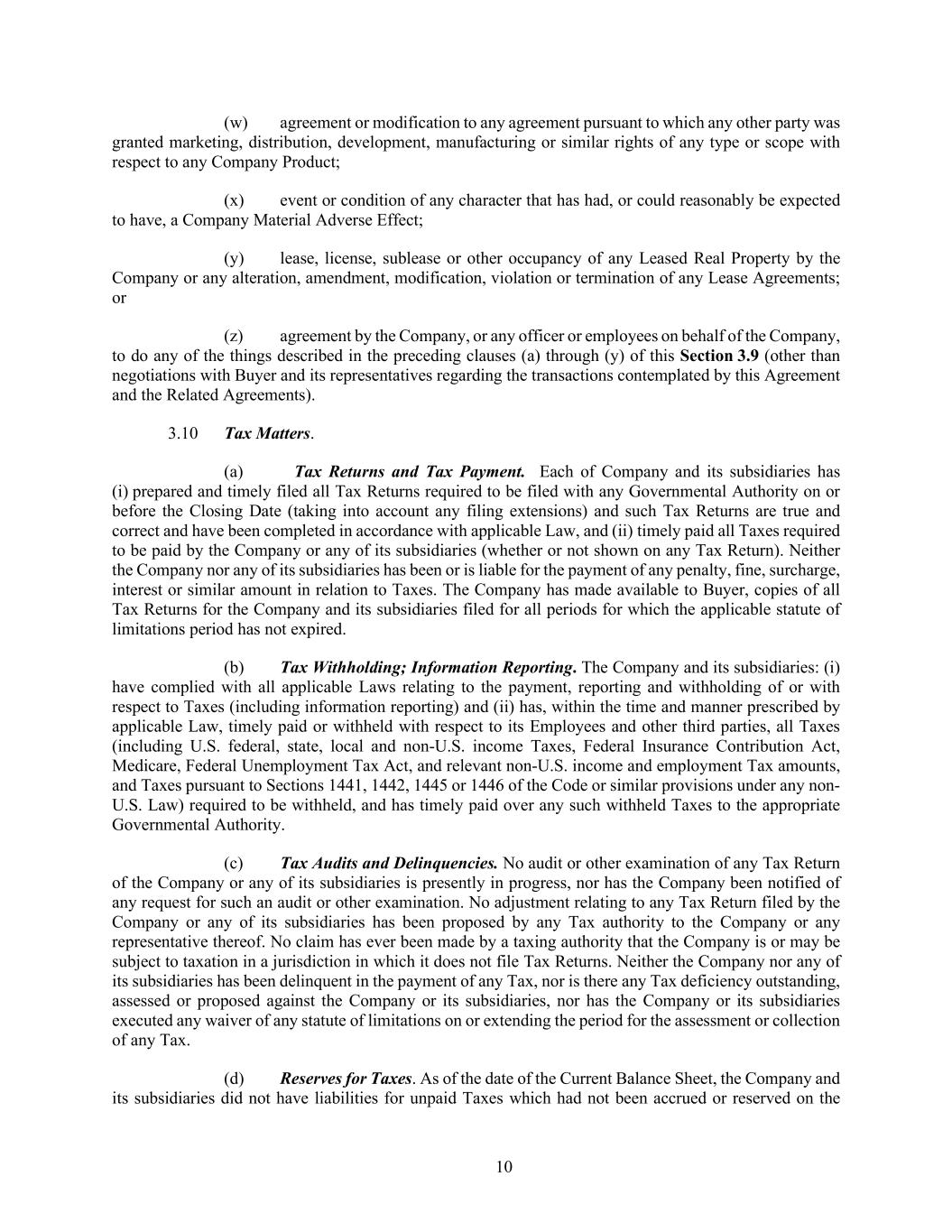 10 (w) agreement or modification to any agreement pursuant to which any other party was granted marketing, distribution, development, manufacturing or similar rights of any type or scope with respect to any Company Product; (x) event or condition of any character that has had, or could reasonably be expected to have, a Company Material Adverse Effect; (y) lease, license, sublease or other occupancy of any Leased Real Property by the Company or any alteration, amendment, modification, violation or termination of any Lease Agreements; or (z) agreement by the Company, or any officer or employees on behalf of the Company, to do any of the things described in the preceding clauses (a) through (y) of this Section 3.9 (other than negotiations with Buyer and its representatives regarding the transactions contemplated by this Agreement and the Related Agreements). 3.10 Tax Matters. (a) Tax Returns and Tax Payment. Each of Company and its subsidiaries has (i) prepared and timely filed all Tax Returns required to be filed with any Governmental Authority on or before the Closing Date (taking into account any filing extensions) and such Tax Returns are true and correct and have been completed in accordance with applicable Law, and (ii) timely paid all Taxes required to be paid by the Company or any of its subsidiaries (whether or not shown on any Tax Return). Neither the Company nor any of its subsidiaries has been or is liable for the payment of any penalty, fine, surcharge, interest or similar amount in relation to Taxes. The Company has made available to Buyer, copies of all Tax Returns for the Company and its subsidiaries filed for all periods for which the applicable statute of limitations period has not expired. (b) Tax Withholding; Information Reporting. The Company and its subsidiaries: (i) have complied with all applicable Laws relating to the payment, reporting and withholding of or with respect to Taxes (including information reporting) and (ii) has, within the time and manner prescribed by applicable Law, timely paid or withheld with respect to its Employees and other third parties, all Taxes (including U.S. federal, state, local and non-U.S. income Taxes, Federal Insurance Contribution Act, Medicare, Federal Unemployment Tax Act, and relevant non-U.S. income and employment Tax amounts, and Taxes pursuant to Sections 1441, 1442, 1445 or 1446 of the Code or similar provisions under any non- U.S. Law) required to be withheld, and has timely paid over any such withheld Taxes to the appropriate Governmental Authority. (c) Tax Audits and Delinquencies. No audit or other examination of any Tax Return of the Company or any of its subsidiaries is presently in progress, nor has the Company been notified of any request for such an audit or other examination. No adjustment relating to any Tax Return filed by the Company or any of its subsidiaries has been proposed by any Tax authority to the Company or any representative thereof. No claim has ever been made by a taxing authority that the Company is or may be subject to taxation in a jurisdiction in which it does not file Tax Returns. Neither the Company nor any of its subsidiaries has been delinquent in the payment of any Tax, nor is there any Tax deficiency outstanding, assessed or proposed against the Company or its subsidiaries, nor has the Company or its subsidiaries executed any waiver of any statute of limitations on or extending the period for the assessment or collection of any Tax. (d) Reserves for Taxes. As of the date of the Current Balance Sheet, the Company and its subsidiaries did not have liabilities for unpaid Taxes which had not been accrued or reserved on the