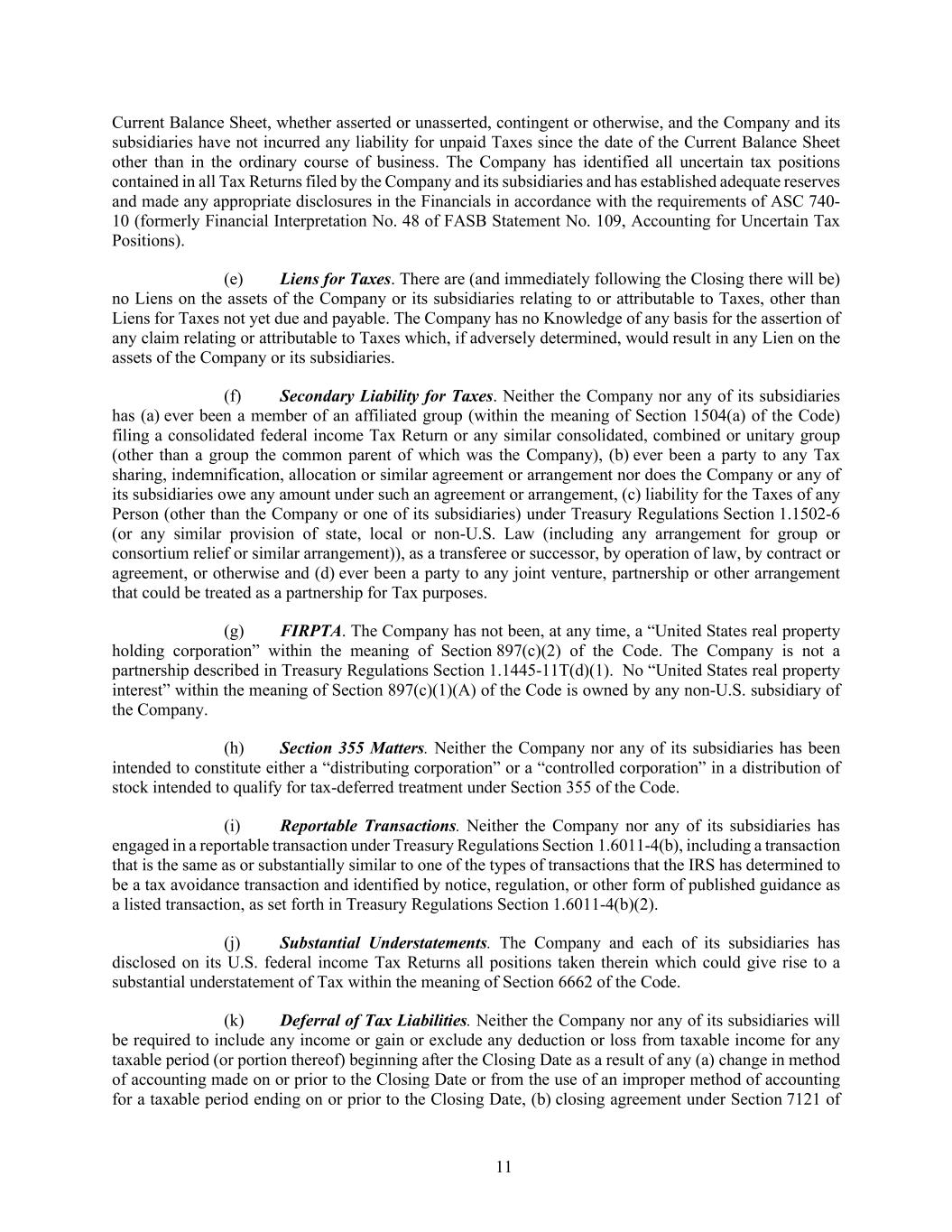 11 Current Balance Sheet, whether asserted or unasserted, contingent or otherwise, and the Company and its subsidiaries have not incurred any liability for unpaid Taxes since the date of the Current Balance Sheet other than in the ordinary course of business. The Company has identified all uncertain tax positions contained in all Tax Returns filed by the Company and its subsidiaries and has established adequate reserves and made any appropriate disclosures in the Financials in accordance with the requirements of ASC 740- 10 (formerly Financial Interpretation No. 48 of FASB Statement No. 109, Accounting for Uncertain Tax Positions). (e) Liens for Taxes. There are (and immediately following the Closing there will be) no Liens on the assets of the Company or its subsidiaries relating to or attributable to Taxes, other than Liens for Taxes not yet due and payable. The Company has no Knowledge of any basis for the assertion of any claim relating or attributable to Taxes which, if adversely determined, would result in any Lien on the assets of the Company or its subsidiaries. (f) Secondary Liability for Taxes. Neither the Company nor any of its subsidiaries has (a) ever been a member of an affiliated group (within the meaning of Section 1504(a) of the Code) filing a consolidated federal income Tax Return or any similar consolidated, combined or unitary group (other than a group the common parent of which was the Company), (b) ever been a party to any Tax sharing, indemnification, allocation or similar agreement or arrangement nor does the Company or any of its subsidiaries owe any amount under such an agreement or arrangement, (c) liability for the Taxes of any Person (other than the Company or one of its subsidiaries) under Treasury Regulations Section 1.1502-6 (or any similar provision of state, local or non-U.S. Law (including any arrangement for group or consortium relief or similar arrangement)), as a transferee or successor, by operation of law, by contract or agreement, or otherwise and (d) ever been a party to any joint venture, partnership or other arrangement that could be treated as a partnership for Tax purposes. (g) FIRPTA. The Company has not been, at any time, a “United States real property holding corporation” within the meaning of Section 897(c)(2) of the Code. The Company is not a partnership described in Treasury Regulations Section 1.1445-11T(d)(1). No “United States real property interest” within the meaning of Section 897(c)(1)(A) of the Code is owned by any non-U.S. subsidiary of the Company. (h) Section 355 Matters. Neither the Company nor any of its subsidiaries has been intended to constitute either a “distributing corporation” or a “controlled corporation” in a distribution of stock intended to qualify for tax-deferred treatment under Section 355 of the Code. (i) Reportable Transactions. Neither the Company nor any of its subsidiaries has engaged in a reportable transaction under Treasury Regulations Section 1.6011-4(b), including a transaction that is the same as or substantially similar to one of the types of transactions that the IRS has determined to be a tax avoidance transaction and identified by notice, regulation, or other form of published guidance as a listed transaction, as set forth in Treasury Regulations Section 1.6011-4(b)(2). (j) Substantial Understatements. The Company and each of its subsidiaries has disclosed on its U.S. federal income Tax Returns all positions taken therein which could give rise to a substantial understatement of Tax within the meaning of Section 6662 of the Code. (k) Deferral of Tax Liabilities. Neither the Company nor any of its subsidiaries will be required to include any income or gain or exclude any deduction or loss from taxable income for any taxable period (or portion thereof) beginning after the Closing Date as a result of any (a) change in method of accounting made on or prior to the Closing Date or from the use of an improper method of accounting for a taxable period ending on or prior to the Closing Date, (b) closing agreement under Section 7121 of