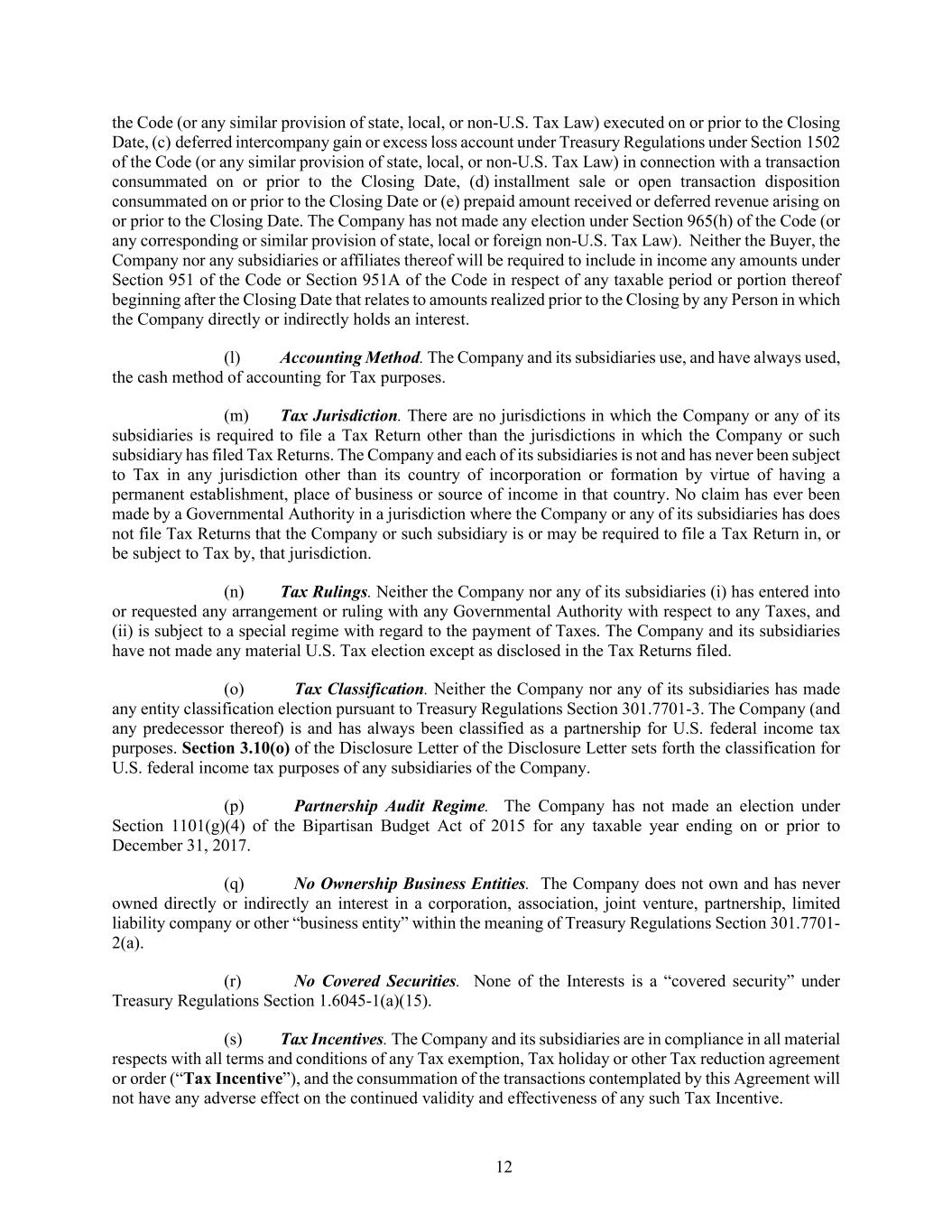 12 the Code (or any similar provision of state, local, or non-U.S. Tax Law) executed on or prior to the Closing Date, (c) deferred intercompany gain or excess loss account under Treasury Regulations under Section 1502 of the Code (or any similar provision of state, local, or non-U.S. Tax Law) in connection with a transaction consummated on or prior to the Closing Date, (d) installment sale or open transaction disposition consummated on or prior to the Closing Date or (e) prepaid amount received or deferred revenue arising on or prior to the Closing Date. The Company has not made any election under Section 965(h) of the Code (or any corresponding or similar provision of state, local or foreign non-U.S. Tax Law). Neither the Buyer, the Company nor any subsidiaries or affiliates thereof will be required to include in income any amounts under Section 951 of the Code or Section 951A of the Code in respect of any taxable period or portion thereof beginning after the Closing Date that relates to amounts realized prior to the Closing by any Person in which the Company directly or indirectly holds an interest. (l) Accounting Method. The Company and its subsidiaries use, and have always used, the cash method of accounting for Tax purposes. (m) Tax Jurisdiction. There are no jurisdictions in which the Company or any of its subsidiaries is required to file a Tax Return other than the jurisdictions in which the Company or such subsidiary has filed Tax Returns. The Company and each of its subsidiaries is not and has never been subject to Tax in any jurisdiction other than its country of incorporation or formation by virtue of having a permanent establishment, place of business or source of income in that country. No claim has ever been made by a Governmental Authority in a jurisdiction where the Company or any of its subsidiaries has does not file Tax Returns that the Company or such subsidiary is or may be required to file a Tax Return in, or be subject to Tax by, that jurisdiction. (n) Tax Rulings. Neither the Company nor any of its subsidiaries (i) has entered into or requested any arrangement or ruling with any Governmental Authority with respect to any Taxes, and (ii) is subject to a special regime with regard to the payment of Taxes. The Company and its subsidiaries have not made any material U.S. Tax election except as disclosed in the Tax Returns filed. (o) Tax Classification. Neither the Company nor any of its subsidiaries has made any entity classification election pursuant to Treasury Regulations Section 301.7701-3. The Company (and any predecessor thereof) is and has always been classified as a partnership for U.S. federal income tax purposes. Section 3.10(o) of the Disclosure Letter of the Disclosure Letter sets forth the classification for U.S. federal income tax purposes of any subsidiaries of the Company. (p) Partnership Audit Regime. The Company has not made an election under Section 1101(g)(4) of the Bipartisan Budget Act of 2015 for any taxable year ending on or prior to December 31, 2017. (q) No Ownership Business Entities. The Company does not own and has never owned directly or indirectly an interest in a corporation, association, joint venture, partnership, limited liability company or other “business entity” within the meaning of Treasury Regulations Section 301.7701- 2(a). (r) No Covered Securities. None of the Interests is a “covered security” under Treasury Regulations Section 1.6045-1(a)(15). (s) Tax Incentives. The Company and its subsidiaries are in compliance in all material respects with all terms and conditions of any Tax exemption, Tax holiday or other Tax reduction agreement or order (“Tax Incentive”), and the consummation of the transactions contemplated by this Agreement will not have any adverse effect on the continued validity and effectiveness of any such Tax Incentive.