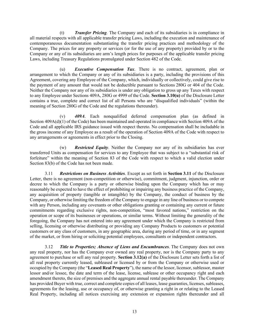 13 (t) Transfer Pricing. The Company and each of its subsidiaries is in compliance in all material respects with all applicable transfer pricing Laws, including the execution and maintenance of contemporaneous documentation substantiating the transfer pricing practices and methodology of the Company. The prices for any property or services (or for the use of any property) provided by or to the Company or any of its subsidiaries are arm’s length prices for purposes of the applicable transfer pricing Laws, including Treasury Regulations promulgated under Section 482 of the Code. (u) Executive Compensation Tax. There is no contract, agreement, plan or arrangement to which the Company or any of its subsidiaries is a party, including the provisions of this Agreement, covering any Employee of the Company, which, individually or collectively, could give rise to the payment of any amount that would not be deductible pursuant to Sections 280G or 404 of the Code. Neither the Company nor any of its subsidiaries is under any obligation to gross up any Taxes with respect to any Employee under Sections 409A, 280G or 4999 of the Code. Section 3.10(u) of the Disclosure Letter contains a true, complete and correct list of all Persons who are “disqualified individuals” (within the meaning of Section 280G of the Code and the regulations thereunder). (v) 409A. Each nonqualified deferred compensation plan (as defined in Section 409A(d)(1) of the Code) has been maintained and operated in compliance with Section 409A of the Code and all applicable IRS guidance issued with respect thereto. No compensation shall be includable in the gross income of any Employee as a result of the operation of Section 409A of the Code with respect to any arrangements or agreements in effect prior to the Closing. (w) Restricted Equity. Neither the Company nor any of its subsidiaries has ever transferred Units as compensation for services to any Employee that was subject to a “substantial risk of forfeiture” within the meaning of Section 83 of the Code with respect to which a valid election under Section 83(b) of the Code has not been made. 3.11 Restrictions on Business Activities. Except as set forth in Section 3.11 of the Disclosure Letter, there is no agreement (non-competition or otherwise), commitment, judgment, injunction, order or decree to which the Company is a party or otherwise binding upon the Company which has or may reasonably be expected to have the effect of prohibiting or impairing any business practice of the Company, any acquisition of property (tangible or intangible) by the Company, the conduct of business by the Company, or otherwise limiting the freedom of the Company to engage in any line of business or to compete with any Person, including any covenants or other obligations granting or containing any current or future commitments regarding exclusive rights, non-competition, “most favored nations,” restriction on the operation or scope of its businesses or operations, or similar terms. Without limiting the generality of the foregoing, the Company has not entered into any agreement under which the Company is restricted from selling, licensing or otherwise distributing or providing any Company Products to customers or potential customers or any class of customers, in any geographic area, during any period of time, or in any segment of the market, or from hiring or soliciting potential employees, consultants or independent contractors. 3.12 Title to Properties; Absence of Liens and Encumbrances. The Company does not own any real property, nor has the Company ever owned any real property, nor is the Company party to any agreement to purchase or sell any real property. Section 3.12(a) of the Disclosure Letter sets forth a list of all real property currently leased, subleased or licensed by or from the Company or otherwise used or occupied by the Company (the “Leased Real Property”), the name of the lessor, licensor, sublessor, master lessor and/or lessee, the date and term of the lease, license, sublease or other occupancy right and each amendment thereto, the size of premises and the aggregate annual rental payable thereunder. The Company has provided Buyer with true, correct and complete copies of all leases, lease guaranties, licenses, subleases, agreements for the leasing, use or occupancy of, or otherwise granting a right in or relating to the Leased Real Property, including all notices exercising any extension or expansion rights thereunder and all