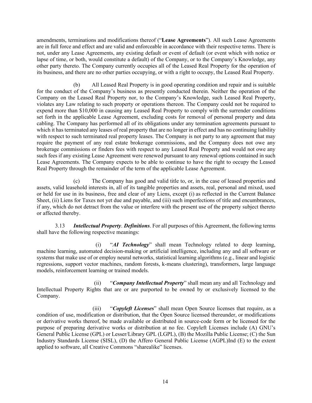 14 amendments, terminations and modifications thereof (“Lease Agreements”). All such Lease Agreements are in full force and effect and are valid and enforceable in accordance with their respective terms. There is not, under any Lease Agreements, any existing default or event of default (or event which with notice or lapse of time, or both, would constitute a default) of the Company, or to the Company’s Knowledge, any other party thereto. The Company currently occupies all of the Leased Real Property for the operation of its business, and there are no other parties occupying, or with a right to occupy, the Leased Real Property. (b) All Leased Real Property is in good operating condition and repair and is suitable for the conduct of the Company’s business as presently conducted therein. Neither the operation of the Company on the Leased Real Property nor, to the Company’s Knowledge, such Leased Real Property, violates any Law relating to such property or operations thereon. The Company could not be required to expend more than $10,000 in causing any Leased Real Property to comply with the surrender conditions set forth in the applicable Lease Agreement, excluding costs for removal of personal property and data cabling. The Company has performed all of its obligations under any termination agreements pursuant to which it has terminated any leases of real property that are no longer in effect and has no continuing liability with respect to such terminated real property leases. The Company is not party to any agreement that may require the payment of any real estate brokerage commissions, and the Company does not owe any brokerage commissions or finders fees with respect to any Leased Real Property and would not owe any such fees if any existing Lease Agreement were renewed pursuant to any renewal options contained in such Lease Agreements. The Company expects to be able to continue to have the right to occupy the Leased Real Property through the remainder of the term of the applicable Lease Agreement. (c) The Company has good and valid title to, or, in the case of leased properties and assets, valid leasehold interests in, all of its tangible properties and assets, real, personal and mixed, used or held for use in its business, free and clear of any Liens, except (i) as reflected in the Current Balance Sheet, (ii) Liens for Taxes not yet due and payable, and (iii) such imperfections of title and encumbrances, if any, which do not detract from the value or interfere with the present use of the property subject thereto or affected thereby. 3.13 Intellectual Property. Definitions. For all purposes of this Agreement, the following terms shall have the following respective meanings: (i) “AI Technology” shall mean Technology related to deep learning, machine learning, automated decision-making or artificial intelligence, including any and all software or systems that make use of or employ neural networks, statistical learning algorithms (e.g., linear and logistic regressions, support vector machines, random forests, k-means clustering), transformers, large language models, reinforcement learning or trained models. (ii) “Company Intellectual Property” shall mean any and all Technology and Intellectual Property Rights that are or are purported to be owned by or exclusively licensed to the Company. (iii) “Copyleft Licenses” shall mean Open Source licenses that require, as a condition of use, modification or distribution, that the Open Source licensed thereunder, or modifications or derivative works thereof, be made available or distributed in source-code form or be licensed for the purpose of preparing derivative works or distribution at no fee. Copyleft Licenses include (A) GNU’s General Public License (GPL) or Lesser/Library GPL (LGPL), (B) the Mozilla Public License; (C) the Sun Industry Standards License (SISL), (D) the Affero General Public License (AGPL)Ind (E) to the extent applied to software, all Creative Commons “sharealike” licenses.