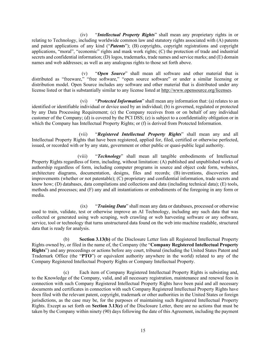 15 (iv) “Intellectual Property Rights” shall mean any proprietary rights in or relating to Technology, including worldwide common law and statutory rights associated with (A) patents and patent applications of any kind (“Patents”); (B) copyrights, copyright registrations and copyright applications, “moral”, “economic” rights and mask work rights; (C) the protection of trade and industrial secrets and confidential information; (D) logos, trademarks, trade names and service marks; and (E) domain names and web addresses; as well as any analogous rights to those set forth above. (v) “Open Source” shall mean all software and other material that is distributed as “freeware,” “free software,” “open source software” or under a similar licensing or distribution model. Open Source includes any software and other material that is distributed under any license listed or that is substantially similar to any license listed at http://www.opensource.org/licenses. (vi) “Protected Information” shall mean any information that: (a) relates to an identified or identifiable individual or device used by an individual; (b) is governed, regulated or protected by any Data Processing Requirement; (c) the Company receives from or on behalf of any individual customer of the Company; (d) is covered by the PCI DSS; (e) is subject to a confidentiality obligation or in which the Company has Intellectual Property Rights; or (f) is derived from Protected Information. (vii) “Registered Intellectual Property Rights” shall mean any and all Intellectual Property Rights that have been registered, applied for, filed, certified or otherwise perfected, issued, or recorded with or by any state, government or other public or quasi-public legal authority. (viii) “Technology” shall mean all tangible embodiments of Intellectual Property Rights regardless of form, including, without limitation: (A) published and unpublished works of authorship regardless of form, including computer programs in source and object code form, websites, architecture diagrams, documentation, designs, files and records; (B) inventions, discoveries and improvements (whether or not patentable); (C) proprietary and confidential information, trade secrets and know how; (D) databases, data compilations and collections and data (including technical data); (E) tools, methods and processes; and (F) any and all instantiations or embodiments of the foregoing in any form or media. (ix) “Training Data” shall mean any data or databases, processed or otherwise used to train, validate, test or otherwise improve an AI Technology, including any such data that was collected or generated using web scraping, web crawling or web harvesting software or any software, service, tool or technology that turns unstructured data found on the web into machine readable, structured data that is ready for analysis. (b) Section 3.13(b) of the Disclosure Letter lists all Registered Intellectual Property Rights owned by, or filed in the name of, the Company (the “Company Registered Intellectual Property Rights”) and any proceedings or actions before any court, tribunal (including the United States Patent and Trademark Office (the “PTO”) or equivalent authority anywhere in the world) related to any of the Company Registered Intellectual Property Rights or Company Intellectual Property. (c) Each item of Company Registered Intellectual Property Rights is subsisting and, to the Knowledge of the Company, valid, and all necessary registration, maintenance and renewal fees in connection with such Company Registered Intellectual Property Rights have been paid and all necessary documents and certificates in connection with such Company Registered Intellectual Property Rights have been filed with the relevant patent, copyright, trademark or other authorities in the United States or foreign jurisdictions, as the case may be, for the purposes of maintaining such Registered Intellectual Property Rights. Except as set forth on Section 3.13(c) of the Disclosure Letter, there are no actions that must be taken by the Company within ninety (90) days following the date of this Agreement, including the payment