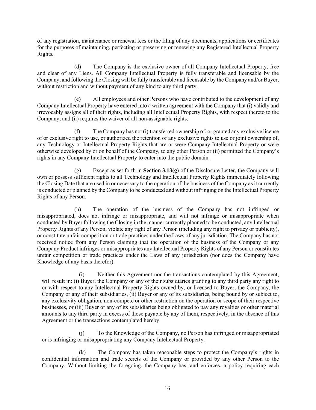 16 of any registration, maintenance or renewal fees or the filing of any documents, applications or certificates for the purposes of maintaining, perfecting or preserving or renewing any Registered Intellectual Property Rights. (d) The Company is the exclusive owner of all Company Intellectual Property, free and clear of any Liens. All Company Intellectual Property is fully transferable and licensable by the Company, and following the Closing will be fully transferable and licensable by the Company and/or Buyer, without restriction and without payment of any kind to any third party. (e) All employees and other Persons who have contributed to the development of any Company Intellectual Property have entered into a written agreement with the Company that (i) validly and irrevocably assigns all of their rights, including all Intellectual Property Rights, with respect thereto to the Company, and (ii) requires the waiver of all non-assignable rights. (f) The Company has not (i) transferred ownership of, or granted any exclusive license of or exclusive right to use, or authorized the retention of any exclusive rights to use or joint ownership of, any Technology or Intellectual Property Rights that are or were Company Intellectual Property or were otherwise developed by or on behalf of the Company, to any other Person or (ii) permitted the Company’s rights in any Company Intellectual Property to enter into the public domain. (g) Except as set forth in Section 3.13(g) of the Disclosure Letter, the Company will own or possess sufficient rights to all Technology and Intellectual Property Rights immediately following the Closing Date that are used in or necessary to the operation of the business of the Company as it currently is conducted or planned by the Company to be conducted and without infringing on the Intellectual Property Rights of any Person. (h) The operation of the business of the Company has not infringed or misappropriated, does not infringe or misappropriate, and will not infringe or misappropriate when conducted by Buyer following the Closing in the manner currently planned to be conducted, any Intellectual Property Rights of any Person, violate any right of any Person (including any right to privacy or publicity), or constitute unfair competition or trade practices under the Laws of any jurisdiction. The Company has not received notice from any Person claiming that the operation of the business of the Company or any Company Product infringes or misappropriates any Intellectual Property Rights of any Person or constitutes unfair competition or trade practices under the Laws of any jurisdiction (nor does the Company have Knowledge of any basis therefor). (i) Neither this Agreement nor the transactions contemplated by this Agreement, will result in: (i) Buyer, the Company or any of their subsidiaries granting to any third party any right to or with respect to any Intellectual Property Rights owned by, or licensed to Buyer, the Company, the Company or any of their subsidiaries, (ii) Buyer or any of its subsidiaries, being bound by or subject to, any exclusivity obligation, non-compete or other restriction on the operation or scope of their respective businesses, or (iii) Buyer or any of its subsidiaries being obligated to pay any royalties or other material amounts to any third party in excess of those payable by any of them, respectively, in the absence of this Agreement or the transactions contemplated hereby. (j) To the Knowledge of the Company, no Person has infringed or misappropriated or is infringing or misappropriating any Company Intellectual Property. (k) The Company has taken reasonable steps to protect the Company’s rights in confidential information and trade secrets of the Company or provided by any other Person to the Company. Without limiting the foregoing, the Company has, and enforces, a policy requiring each