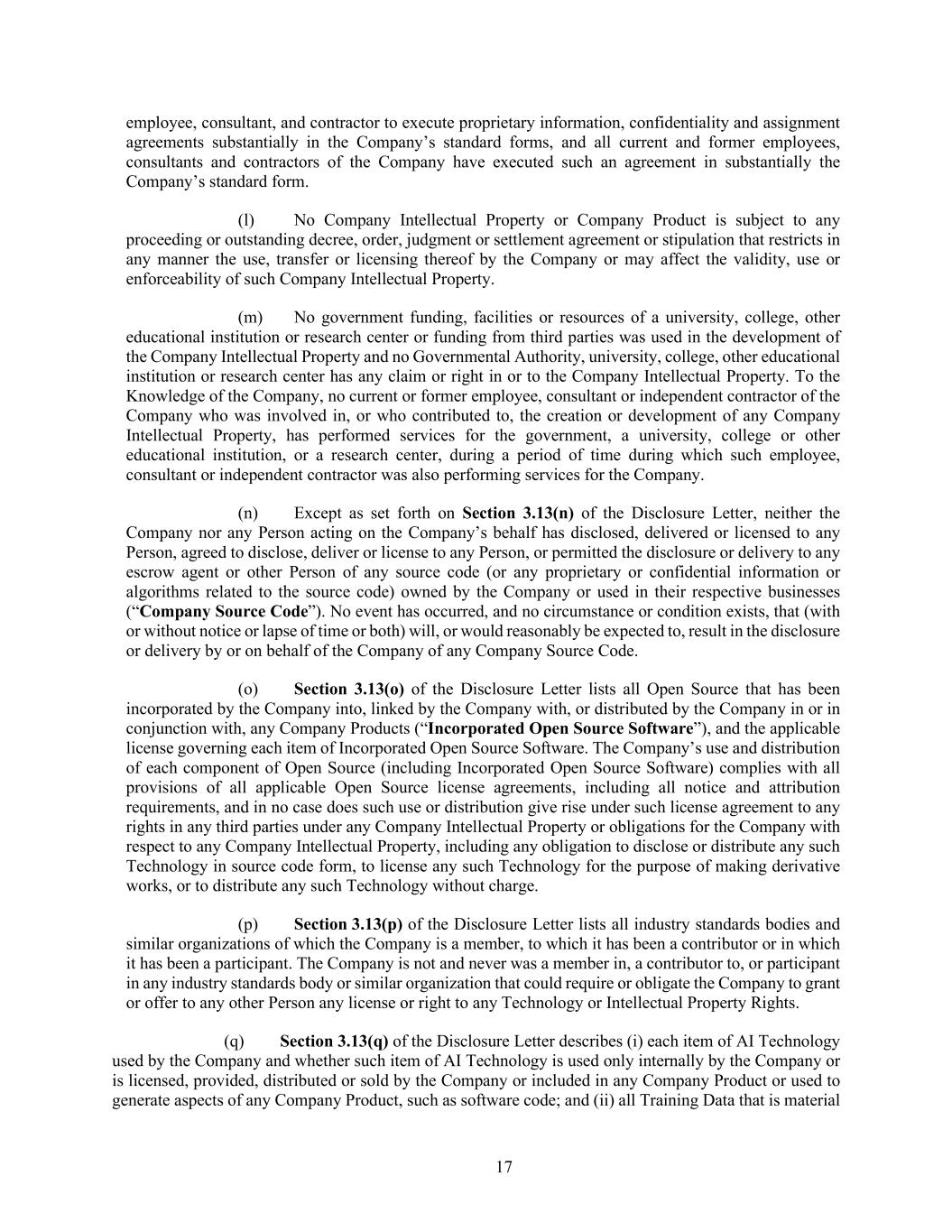17 employee, consultant, and contractor to execute proprietary information, confidentiality and assignment agreements substantially in the Company’s standard forms, and all current and former employees, consultants and contractors of the Company have executed such an agreement in substantially the Company’s standard form. (l) No Company Intellectual Property or Company Product is subject to any proceeding or outstanding decree, order, judgment or settlement agreement or stipulation that restricts in any manner the use, transfer or licensing thereof by the Company or may affect the validity, use or enforceability of such Company Intellectual Property. (m) No government funding, facilities or resources of a university, college, other educational institution or research center or funding from third parties was used in the development of the Company Intellectual Property and no Governmental Authority, university, college, other educational institution or research center has any claim or right in or to the Company Intellectual Property. To the Knowledge of the Company, no current or former employee, consultant or independent contractor of the Company who was involved in, or who contributed to, the creation or development of any Company Intellectual Property, has performed services for the government, a university, college or other educational institution, or a research center, during a period of time during which such employee, consultant or independent contractor was also performing services for the Company. (n) Except as set forth on Section 3.13(n) of the Disclosure Letter, neither the Company nor any Person acting on the Company’s behalf has disclosed, delivered or licensed to any Person, agreed to disclose, deliver or license to any Person, or permitted the disclosure or delivery to any escrow agent or other Person of any source code (or any proprietary or confidential information or algorithms related to the source code) owned by the Company or used in their respective businesses (“Company Source Code”). No event has occurred, and no circumstance or condition exists, that (with or without notice or lapse of time or both) will, or would reasonably be expected to, result in the disclosure or delivery by or on behalf of the Company of any Company Source Code. (o) Section 3.13(o) of the Disclosure Letter lists all Open Source that has been incorporated by the Company into, linked by the Company with, or distributed by the Company in or in conjunction with, any Company Products (“Incorporated Open Source Software”), and the applicable license governing each item of Incorporated Open Source Software. The Company’s use and distribution of each component of Open Source (including Incorporated Open Source Software) complies with all provisions of all applicable Open Source license agreements, including all notice and attribution requirements, and in no case does such use or distribution give rise under such license agreement to any rights in any third parties under any Company Intellectual Property or obligations for the Company with respect to any Company Intellectual Property, including any obligation to disclose or distribute any such Technology in source code form, to license any such Technology for the purpose of making derivative works, or to distribute any such Technology without charge. (p) Section 3.13(p) of the Disclosure Letter lists all industry standards bodies and similar organizations of which the Company is a member, to which it has been a contributor or in which it has been a participant. The Company is not and never was a member in, a contributor to, or participant in any industry standards body or similar organization that could require or obligate the Company to grant or offer to any other Person any license or right to any Technology or Intellectual Property Rights. (q) Section 3.13(q) of the Disclosure Letter describes (i) each item of AI Technology used by the Company and whether such item of AI Technology is used only internally by the Company or is licensed, provided, distributed or sold by the Company or included in any Company Product or used to generate aspects of any Company Product, such as software code; and (ii) all Training Data that is material