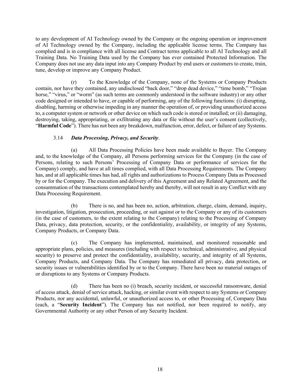 18 to any development of AI Technology owned by the Company or the ongoing operation or improvement of AI Technology owned by the Company, including the applicable license terms. The Company has complied and is in compliance with all license and Contract terms applicable to all AI Technology and all Training Data. No Training Data used by the Company has ever contained Protected Information. The Company does not use any data input into any Company Product by end users or customers to create, train, tune, develop or improve any Company Product. (r) To the Knowledge of the Company, none of the Systems or Company Products contain, nor have they contained, any undisclosed “back door,” “drop dead device,” “time bomb,” “Trojan horse,” “virus,” or “worm” (as such terms are commonly understood in the software industry) or any other code designed or intended to have, or capable of performing, any of the following functions: (i) disrupting, disabling, harming or otherwise impeding in any manner the operation of, or providing unauthorized access to, a computer system or network or other device on which such code is stored or installed; or (ii) damaging, destroying, taking, appropriating, or exfiltrating any data or file without the user’s consent (collectively, “Harmful Code”). There has not been any breakdown, malfunction, error, defect, or failure of any Systems. 3.14 Data Processing, Privacy, and Security. (a) All Data Processing Policies have been made available to Buyer. The Company and, to the knowledge of the Company, all Persons performing services for the Company (in the case of Persons, relating to such Persons’ Processing of Company Data or performance of services for the Company) comply, and have at all times complied, with all Data Processing Requirements. The Company has, and at all applicable times has had, all rights and authorizations to Process Company Data as Processed by or for the Company. The execution and delivery of this Agreement and any Related Agreement, and the consummation of the transactions contemplated hereby and thereby, will not result in any Conflict with any Data Processing Requirement. (b) There is no, and has been no, action, arbitration, charge, claim, demand, inquiry, investigation, litigation, prosecution, proceeding, or suit against or to the Company or any of its customers (in the case of customers, to the extent relating to the Company) relating to the Processing of Company Data, privacy, data protection, security, or the confidentiality, availability, or integrity of any Systems, Company Products, or Company Data. (c) The Company has implemented, maintained, and monitored reasonable and appropriate plans, policies, and measures (including with respect to technical, administrative, and physical security) to preserve and protect the confidentiality, availability, security, and integrity of all Systems, Company Products, and Company Data. The Company has remediated all privacy, data protection, or security issues or vulnerabilities identified by or to the Company. There have been no material outages of or disruptions to any Systems or Company Products. (d) There has been no (i) breach, security incident, or successful ransomware, denial of access attack, denial of service attack, hacking, or similar event with respect to any Systems or Company Products, nor any accidental, unlawful, or unauthorized access to, or other Processing of, Company Data (each, a “Security Incident”). The Company has not notified, nor been required to notify, any Governmental Authority or any other Person of any Security Incident.