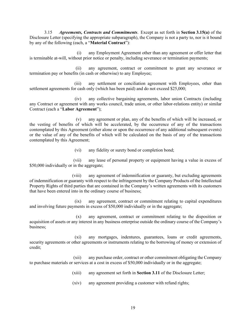 19 3.15 Agreements, Contracts and Commitments. Except as set forth in Section 3.15(a) of the Disclosure Letter (specifying the appropriate subparagraph), the Company is not a party to, nor is it bound by any of the following (each, a “Material Contract”): (i) any Employment Agreement other than any agreement or offer letter that is terminable at-will, without prior notice or penalty, including severance or termination payments; (ii) any agreement, contract or commitment to grant any severance or termination pay or benefits (in cash or otherwise) to any Employee; (iii) any settlement or conciliation agreement with Employees, other than settlement agreements for cash only (which has been paid) and do not exceed $25,000; (iv) any collective bargaining agreements, labor union Contracts (including any Contract or agreement with any works council, trade union, or other labor-relations entity) or similar Contract (each a “Labor Agreement”); (v) any agreement or plan, any of the benefits of which will be increased, or the vesting of benefits of which will be accelerated, by the occurrence of any of the transactions contemplated by this Agreement (either alone or upon the occurrence of any additional subsequent events) or the value of any of the benefits of which will be calculated on the basis of any of the transactions contemplated by this Agreement; (vi) any fidelity or surety bond or completion bond; (vii) any lease of personal property or equipment having a value in excess of $50,000 individually or in the aggregate; (viii) any agreement of indemnification or guaranty, but excluding agreements of indemnification or guaranty with respect to the infringement by the Company Products of the Intellectual Property Rights of third parties that are contained in the Company’s written agreements with its customers that have been entered into in the ordinary course of business; (ix) any agreement, contract or commitment relating to capital expenditures and involving future payments in excess of $50,000 individually or in the aggregate; (x) any agreement, contract or commitment relating to the disposition or acquisition of assets or any interest in any business enterprise outside the ordinary course of the Company’s business; (xi) any mortgages, indentures, guarantees, loans or credit agreements, security agreements or other agreements or instruments relating to the borrowing of money or extension of credit; (xii) any purchase order, contract or other commitment obligating the Company to purchase materials or services at a cost in excess of $50,000 individually or in the aggregate; (xiii) any agreement set forth in Section 3.11 of the Disclosure Letter; (xiv) any agreement providing a customer with refund rights;