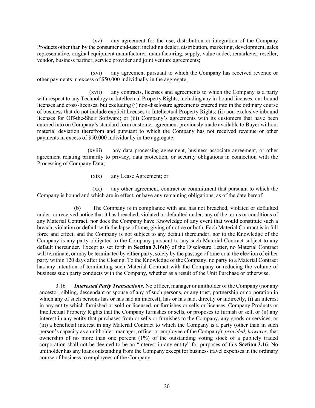 20 (xv) any agreement for the use, distribution or integration of the Company Products other than by the consumer end-user, including dealer, distribution, marketing, development, sales representative, original equipment manufacturer, manufacturing, supply, value added, remarketer, reseller, vendor, business partner, service provider and joint venture agreements; (xvi) any agreement pursuant to which the Company has received revenue or other payments in excess of $50,000 individually in the aggregate; (xvii) any contracts, licenses and agreements to which the Company is a party with respect to any Technology or Intellectual Property Rights, including any in-bound licenses, out-bound licenses and cross-licenses, but excluding (i) non-disclosure agreements entered into in the ordinary course of business that do not include explicit licenses to Intellectual Property Rights; (ii) non-exclusive inbound licenses for Off-the-Shelf Software; or (iii) Company’s agreements with its customers that have been entered into on Company’s standard form customer agreement previously made available to Buyer without material deviation therefrom and pursuant to which the Company has not received revenue or other payments in excess of $50,000 individually in the aggregate; (xviii) any data processing agreement, business associate agreement, or other agreement relating primarily to privacy, data protection, or security obligations in connection with the Processing of Company Data; (xix) any Lease Agreement; or (xx) any other agreement, contract or commitment that pursuant to which the Company is bound and which are in effect, or have any remaining obligations, as of the date hereof. (b) The Company is in compliance with and has not breached, violated or defaulted under, or received notice that it has breached, violated or defaulted under, any of the terms or conditions of any Material Contract, nor does the Company have Knowledge of any event that would constitute such a breach, violation or default with the lapse of time, giving of notice or both. Each Material Contract is in full force and effect, and the Company is not subject to any default thereunder, nor to the Knowledge of the Company is any party obligated to the Company pursuant to any such Material Contract subject to any default thereunder. Except as set forth in Section 3.16(b) of the Disclosure Letter, no Material Contract will terminate, or may be terminated by either party, solely by the passage of time or at the election of either party within 120 days after the Closing. To the Knowledge of the Company, no party to a Material Contract has any intention of terminating such Material Contract with the Company or reducing the volume of business such party conducts with the Company, whether as a result of the Unit Purchase or otherwise. 3.16 Interested Party Transactions. No officer, manager or unitholder of the Company (nor any ancestor, sibling, descendant or spouse of any of such persons, or any trust, partnership or corporation in which any of such persons has or has had an interest), has or has had, directly or indirectly, (i) an interest in any entity which furnished or sold or licensed, or furnishes or sells or licenses, Company Products or Intellectual Property Rights that the Company furnishes or sells, or proposes to furnish or sell, or (ii) any interest in any entity that purchases from or sells or furnishes to the Company, any goods or services, or (iii) a beneficial interest in any Material Contract to which the Company is a party (other than in such person’s capacity as a unitholder, manager, officer or employee of the Company); provided, however, that ownership of no more than one percent (1%) of the outstanding voting stock of a publicly traded corporation shall not be deemed to be an “interest in any entity” for purposes of this Section 3.16. No unitholder has any loans outstanding from the Company except for business travel expenses in the ordinary course of business to employees of the Company.
