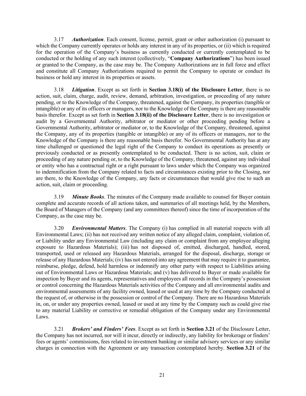 21 3.17 Authorization. Each consent, license, permit, grant or other authorization (i) pursuant to which the Company currently operates or holds any interest in any of its properties, or (ii) which is required for the operation of the Company’s business as currently conducted or currently contemplated to be conducted or the holding of any such interest (collectively, “Company Authorizations”) has been issued or granted to the Company, as the case may be. The Company Authorizations are in full force and effect and constitute all Company Authorizations required to permit the Company to operate or conduct its business or hold any interest in its properties or assets. 3.18 Litigation. Except as set forth in Section 3.18(i) of the Disclosure Letter, there is no action, suit, claim, charge, audit, review, demand, arbitration, investigation, or proceeding of any nature pending, or to the Knowledge of the Company, threatened, against the Company, its properties (tangible or intangible) or any of its officers or managers, nor to the Knowledge of the Company is there any reasonable basis therefor. Except as set forth in Section 3.18(ii) of the Disclosure Letter, there is no investigation or audit by a Governmental Authority, arbitrator or mediator or other proceeding pending before a Governmental Authority, arbitrator or mediator or, to the Knowledge of the Company, threatened, against the Company, any of its properties (tangible or intangible) or any of its officers or managers, nor to the Knowledge of the Company is there any reasonable basis therefor. No Governmental Authority has at any time challenged or questioned the legal right of the Company to conduct its operations as presently or previously conducted or as presently contemplated to be conducted. There is no action, suit, claim or proceeding of any nature pending or, to the Knowledge of the Company, threatened, against any individual or entity who has a contractual right or a right pursuant to laws under which the Company was organized to indemnification from the Company related to facts and circumstances existing prior to the Closing, nor are there, to the Knowledge of the Company, any facts or circumstances that would give rise to such an action, suit, claim or proceeding. 3.19 Minute Books. The minutes of the Company made available to counsel for Buyer contain complete and accurate records of all actions taken, and summaries of all meetings held, by the Members, the Board of Managers of the Company (and any committees thereof) since the time of incorporation of the Company, as the case may be. 3.20 Environmental Matters. The Company (i) has complied in all material respects with all Environmental Laws; (ii) has not received any written notice of any alleged claim, complaint, violation of, or Liability under any Environmental Law (including any claim or complaint from any employee alleging exposure to Hazardous Materials); (iii) has not disposed of, emitted, discharged, handled, stored, transported, used or released any Hazardous Materials, arranged for the disposal, discharge, storage or release of any Hazardous Materials; (iv) has not entered into any agreement that may require it to guarantee, reimburse, pledge, defend, hold harmless or indemnify any other party with respect to Liabilities arising out of Environmental Laws or Hazardous Materials; and (v) has delivered to Buyer or made available for inspection by Buyer and its agents, representatives and employees all records in the Company’s possession or control concerning the Hazardous Materials activities of the Company and all environmental audits and environmental assessments of any facility owned, leased or used at any time by the Company conducted at the request of, or otherwise in the possession or control of the Company. There are no Hazardous Materials in, on, or under any properties owned, leased or used at any time by the Company such as could give rise to any material Liability or corrective or remedial obligation of the Company under any Environmental Laws. 3.21 Brokers’ and Finders’ Fees. Except as set forth in Section 3.21 of the Disclosure Letter, the Company has not incurred, nor will it incur, directly or indirectly, any liability for brokerage or finders’ fees or agents’ commissions, fees related to investment banking or similar advisory services or any similar charges in connection with the Agreement or any transaction contemplated hereby. Section 3.21 of the