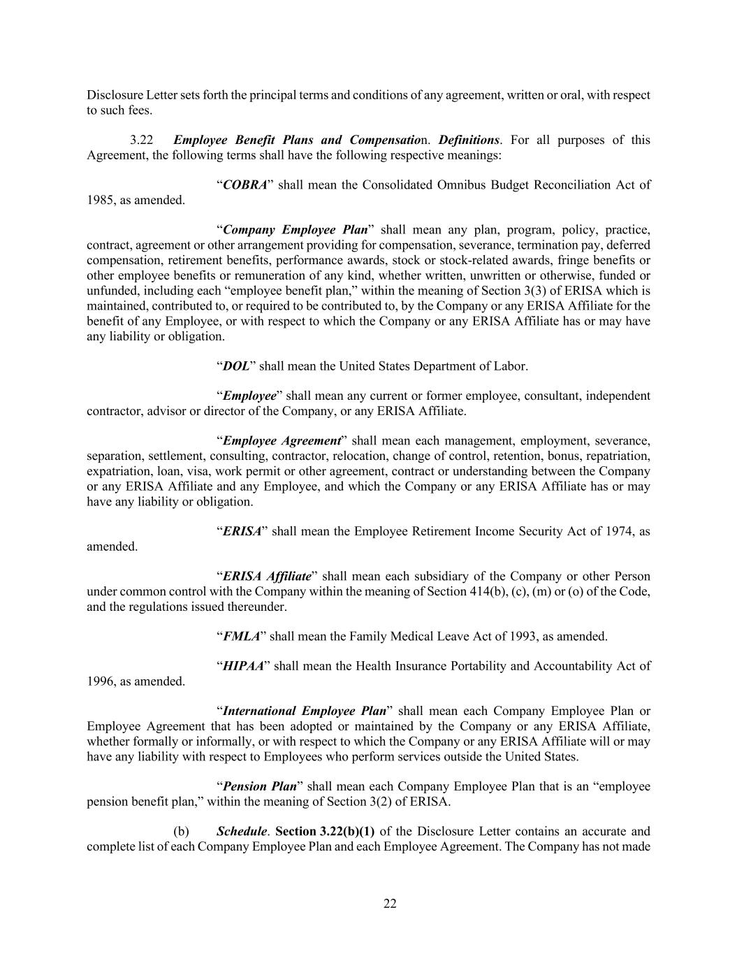 22 Disclosure Letter sets forth the principal terms and conditions of any agreement, written or oral, with respect to such fees. 3.22 Employee Benefit Plans and Compensation. Definitions. For all purposes of this Agreement, the following terms shall have the following respective meanings: “COBRA” shall mean the Consolidated Omnibus Budget Reconciliation Act of 1985, as amended. “Company Employee Plan” shall mean any plan, program, policy, practice, contract, agreement or other arrangement providing for compensation, severance, termination pay, deferred compensation, retirement benefits, performance awards, stock or stock-related awards, fringe benefits or other employee benefits or remuneration of any kind, whether written, unwritten or otherwise, funded or unfunded, including each “employee benefit plan,” within the meaning of Section 3(3) of ERISA which is maintained, contributed to, or required to be contributed to, by the Company or any ERISA Affiliate for the benefit of any Employee, or with respect to which the Company or any ERISA Affiliate has or may have any liability or obligation. “DOL” shall mean the United States Department of Labor. “Employee” shall mean any current or former employee, consultant, independent contractor, advisor or director of the Company, or any ERISA Affiliate. “Employee Agreement” shall mean each management, employment, severance, separation, settlement, consulting, contractor, relocation, change of control, retention, bonus, repatriation, expatriation, loan, visa, work permit or other agreement, contract or understanding between the Company or any ERISA Affiliate and any Employee, and which the Company or any ERISA Affiliate has or may have any liability or obligation. “ERISA” shall mean the Employee Retirement Income Security Act of 1974, as amended. “ERISA Affiliate” shall mean each subsidiary of the Company or other Person under common control with the Company within the meaning of Section 414(b), (c), (m) or (o) of the Code, and the regulations issued thereunder. “FMLA” shall mean the Family Medical Leave Act of 1993, as amended. “HIPAA” shall mean the Health Insurance Portability and Accountability Act of 1996, as amended. “International Employee Plan” shall mean each Company Employee Plan or Employee Agreement that has been adopted or maintained by the Company or any ERISA Affiliate, whether formally or informally, or with respect to which the Company or any ERISA Affiliate will or may have any liability with respect to Employees who perform services outside the United States. “Pension Plan” shall mean each Company Employee Plan that is an “employee pension benefit plan,” within the meaning of Section 3(2) of ERISA. (b) Schedule. Section 3.22(b)(1) of the Disclosure Letter contains an accurate and complete list of each Company Employee Plan and each Employee Agreement. The Company has not made
