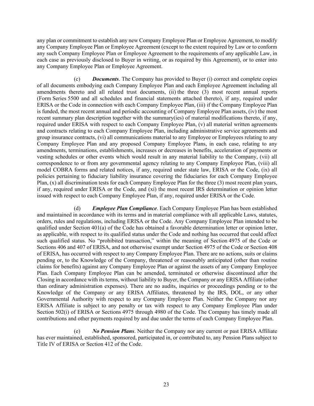 23 any plan or commitment to establish any new Company Employee Plan or Employee Agreement, to modify any Company Employee Plan or Employee Agreement (except to the extent required by Law or to conform any such Company Employee Plan or Employee Agreement to the requirements of any applicable Law, in each case as previously disclosed to Buyer in writing, or as required by this Agreement), or to enter into any Company Employee Plan or Employee Agreement. (c) Documents. The Company has provided to Buyer (i) correct and complete copies of all documents embodying each Company Employee Plan and each Employee Agreement including all amendments thereto and all related trust documents, (ii) the three (3) most recent annual reports (Form Series 5500 and all schedules and financial statements attached thereto), if any, required under ERISA or the Code in connection with each Company Employee Plan, (iii) if the Company Employee Plan is funded, the most recent annual and periodic accounting of Company Employee Plan assets, (iv) the most recent summary plan description together with the summary(ies) of material modifications thereto, if any, required under ERISA with respect to each Company Employee Plan, (v) all material written agreements and contracts relating to each Company Employee Plan, including administrative service agreements and group insurance contracts, (vi) all communications material to any Employee or Employees relating to any Company Employee Plan and any proposed Company Employee Plans, in each case, relating to any amendments, terminations, establishments, increases or decreases in benefits, acceleration of payments or vesting schedules or other events which would result in any material liability to the Company, (vii) all correspondence to or from any governmental agency relating to any Company Employee Plan, (viii) all model COBRA forms and related notices, if any, required under state law, ERISA or the Code, (ix) all policies pertaining to fiduciary liability insurance covering the fiduciaries for each Company Employee Plan, (x) all discrimination tests for each Company Employee Plan for the three (3) most recent plan years, if any, required under ERISA or the Code, and (xi) the most recent IRS determination or opinion letter issued with respect to each Company Employee Plan, if any, required under ERISA or the Code. (d) Employee Plan Compliance. Each Company Employee Plan has been established and maintained in accordance with its terms and in material compliance with all applicable Laws, statutes, orders, rules and regulations, including ERISA or the Code. Any Company Employee Plan intended to be qualified under Section 401(a) of the Code has obtained a favorable determination letter or opinion letter, as applicable, with respect to its qualified status under the Code and nothing has occurred that could affect such qualified status. No “prohibited transaction,” within the meaning of Section 4975 of the Code or Sections 406 and 407 of ERISA, and not otherwise exempt under Section 4975 of the Code or Section 408 of ERISA, has occurred with respect to any Company Employee Plan. There are no actions, suits or claims pending or, to the Knowledge of the Company, threatened or reasonably anticipated (other than routine claims for benefits) against any Company Employee Plan or against the assets of any Company Employee Plan. Each Company Employee Plan can be amended, terminated or otherwise discontinued after the Closing in accordance with its terms, without liability to Buyer, the Company or any ERISA Affiliate (other than ordinary administration expenses). There are no audits, inquiries or proceedings pending or to the Knowledge of the Company or any ERISA Affiliates, threatened by the IRS, DOL, or any other Governmental Authority with respect to any Company Employee Plan. Neither the Company nor any ERISA Affiliate is subject to any penalty or tax with respect to any Company Employee Plan under Section 502(i) of ERISA or Sections 4975 through 4980 of the Code. The Company has timely made all contributions and other payments required by and due under the terms of each Company Employee Plan. (e) No Pension Plans. Neither the Company nor any current or past ERISA Affiliate has ever maintained, established, sponsored, participated in, or contributed to, any Pension Plans subject to Title IV of ERISA or Section 412 of the Code.
