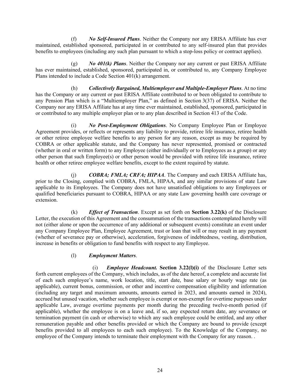 24 (f) No Self-Insured Plans. Neither the Company nor any ERISA Affiliate has ever maintained, established sponsored, participated in or contributed to any self-insured plan that provides benefits to employees (including any such plan pursuant to which a stop-loss policy or contract applies). (g) No 401(k) Plans. Neither the Company nor any current or past ERISA Affiliate has ever maintained, established, sponsored, participated in, or contributed to, any Company Employee Plans intended to include a Code Section 401(k) arrangement. (h) Collectively Bargained, Multiemployer and Multiple-Employer Plans. At no time has the Company or any current or past ERISA Affiliate contributed to or been obligated to contribute to any Pension Plan which is a “Multiemployer Plan,” as defined in Section 3(37) of ERISA. Neither the Company nor any ERISA Affiliate has at any time ever maintained, established, sponsored, participated in or contributed to any multiple employer plan or to any plan described in Section 413 of the Code. (i) No Post-Employment Obligations. No Company Employee Plan or Employee Agreement provides, or reflects or represents any liability to provide, retiree life insurance, retiree health or other retiree employee welfare benefits to any person for any reason, except as may be required by COBRA or other applicable statute, and the Company has never represented, promised or contracted (whether in oral or written form) to any Employee (either individually or to Employees as a group) or any other person that such Employee(s) or other person would be provided with retiree life insurance, retiree health or other retiree employee welfare benefits, except to the extent required by statute. (j) COBRA; FMLA; CRFA; HIPAA. The Company and each ERISA Affiliate has, prior to the Closing, complied with COBRA, FMLA, HIPAA, and any similar provisions of state Law applicable to its Employees. The Company does not have unsatisfied obligations to any Employees or qualified beneficiaries pursuant to COBRA, HIPAA or any state Law governing health care coverage or extension. (k) Effect of Transaction. Except as set forth on Section 3.22(k) of the Disclosure Letter, the execution of this Agreement and the consummation of the transactions contemplated hereby will not (either alone or upon the occurrence of any additional or subsequent events) constitute an event under any Company Employee Plan, Employee Agreement, trust or loan that will or may result in any payment (whether of severance pay or otherwise), acceleration, forgiveness of indebtedness, vesting, distribution, increase in benefits or obligation to fund benefits with respect to any Employee. (l) Employment Matters. (i) Employee Headcount. Section 3.22(l)(i) of the Disclosure Letter sets forth current employees of the Company, which includes, as of the date hereof, a complete and accurate list of each such employee’s name, work location, title, start date, base salary or hourly wage rate (as applicable), current bonus, commission, or other and incentive compensation eligibility and information (including any target and maximum amounts, amounts earned in 2023, and amounts earned in 2024), accrued but unused vacation, whether such employee is exempt or non-exempt for overtime purposes under applicable Law, average overtime payments per month during the preceding twelve-month period (if applicable), whether the employee is on a leave and, if so, any expected return date, any severance or termination payment (in cash or otherwise) to which any such employee could be entitled, and any other remuneration payable and other benefits provided or which the Company are bound to provide (except benefits provided to all employees to each such employee). To the Knowledge of the Company, no employee of the Company intends to terminate their employment with the Company for any reason. .