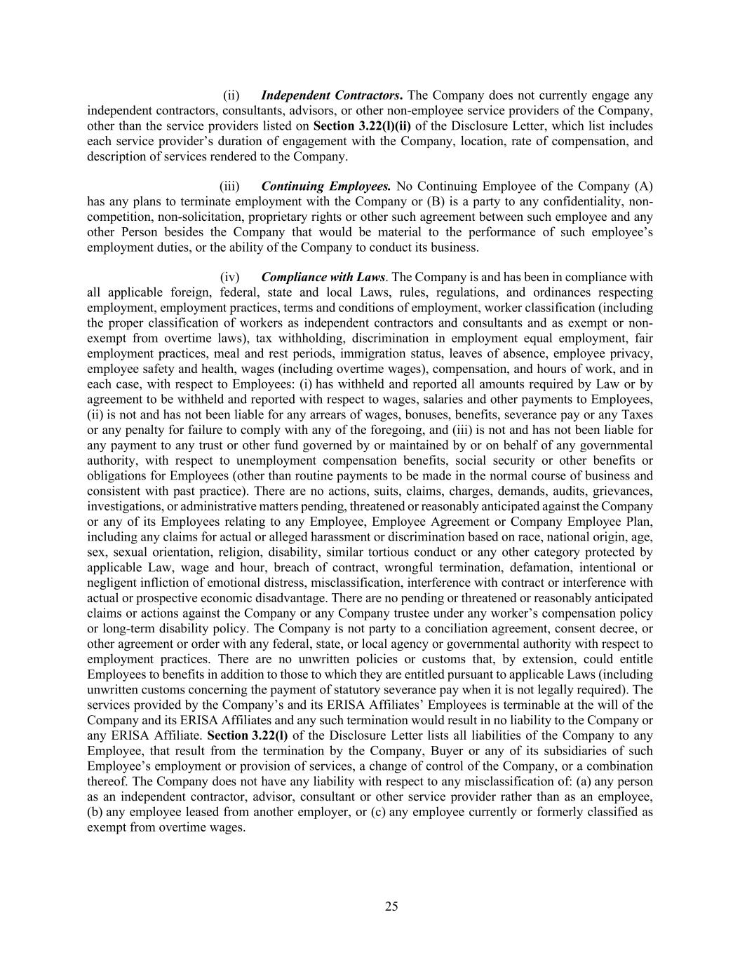 25 (ii) Independent Contractors. The Company does not currently engage any independent contractors, consultants, advisors, or other non-employee service providers of the Company, other than the service providers listed on Section 3.22(l)(ii) of the Disclosure Letter, which list includes each service provider’s duration of engagement with the Company, location, rate of compensation, and description of services rendered to the Company. (iii) Continuing Employees. No Continuing Employee of the Company (A) has any plans to terminate employment with the Company or (B) is a party to any confidentiality, non- competition, non-solicitation, proprietary rights or other such agreement between such employee and any other Person besides the Company that would be material to the performance of such employee’s employment duties, or the ability of the Company to conduct its business. (iv) Compliance with Laws. The Company is and has been in compliance with all applicable foreign, federal, state and local Laws, rules, regulations, and ordinances respecting employment, employment practices, terms and conditions of employment, worker classification (including the proper classification of workers as independent contractors and consultants and as exempt or non- exempt from overtime laws), tax withholding, discrimination in employment equal employment, fair employment practices, meal and rest periods, immigration status, leaves of absence, employee privacy, employee safety and health, wages (including overtime wages), compensation, and hours of work, and in each case, with respect to Employees: (i) has withheld and reported all amounts required by Law or by agreement to be withheld and reported with respect to wages, salaries and other payments to Employees, (ii) is not and has not been liable for any arrears of wages, bonuses, benefits, severance pay or any Taxes or any penalty for failure to comply with any of the foregoing, and (iii) is not and has not been liable for any payment to any trust or other fund governed by or maintained by or on behalf of any governmental authority, with respect to unemployment compensation benefits, social security or other benefits or obligations for Employees (other than routine payments to be made in the normal course of business and consistent with past practice). There are no actions, suits, claims, charges, demands, audits, grievances, investigations, or administrative matters pending, threatened or reasonably anticipated against the Company or any of its Employees relating to any Employee, Employee Agreement or Company Employee Plan, including any claims for actual or alleged harassment or discrimination based on race, national origin, age, sex, sexual orientation, religion, disability, similar tortious conduct or any other category protected by applicable Law, wage and hour, breach of contract, wrongful termination, defamation, intentional or negligent infliction of emotional distress, misclassification, interference with contract or interference with actual or prospective economic disadvantage. There are no pending or threatened or reasonably anticipated claims or actions against the Company or any Company trustee under any worker’s compensation policy or long-term disability policy. The Company is not party to a conciliation agreement, consent decree, or other agreement or order with any federal, state, or local agency or governmental authority with respect to employment practices. There are no unwritten policies or customs that, by extension, could entitle Employees to benefits in addition to those to which they are entitled pursuant to applicable Laws (including unwritten customs concerning the payment of statutory severance pay when it is not legally required). The services provided by the Company’s and its ERISA Affiliates’ Employees is terminable at the will of the Company and its ERISA Affiliates and any such termination would result in no liability to the Company or any ERISA Affiliate. Section 3.22(l) of the Disclosure Letter lists all liabilities of the Company to any Employee, that result from the termination by the Company, Buyer or any of its subsidiaries of such Employee’s employment or provision of services, a change of control of the Company, or a combination thereof. The Company does not have any liability with respect to any misclassification of: (a) any person as an independent contractor, advisor, consultant or other service provider rather than as an employee, (b) any employee leased from another employer, or (c) any employee currently or formerly classified as exempt from overtime wages.