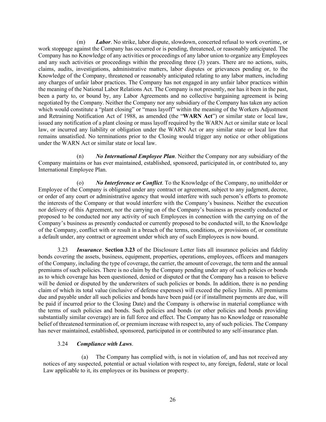 26 (m) Labor. No strike, labor dispute, slowdown, concerted refusal to work overtime, or work stoppage against the Company has occurred or is pending, threatened, or reasonably anticipated. The Company has no Knowledge of any activities or proceedings of any labor union to organize any Employees and any such activities or proceedings within the preceding three (3) years. There are no actions, suits, claims, audits, investigations, administrative matters, labor disputes or grievances pending or, to the Knowledge of the Company, threatened or reasonably anticipated relating to any labor matters, including any charges of unfair labor practices. The Company has not engaged in any unfair labor practices within the meaning of the National Labor Relations Act. The Company is not presently, nor has it been in the past, been a party to, or bound by, any Labor Agreements and no collective bargaining agreement is being negotiated by the Company. Neither the Company nor any subsidiary of the Company has taken any action which would constitute a “plant closing” or “mass layoff” within the meaning of the Workers Adjustment and Retraining Notification Act of 1988, as amended (the “WARN Act”) or similar state or local law, issued any notification of a plant closing or mass layoff required by the WARN Act or similar state or local law, or incurred any liability or obligation under the WARN Act or any similar state or local law that remains unsatisfied. No terminations prior to the Closing would trigger any notice or other obligations under the WARN Act or similar state or local law. (n) No International Employee Plan. Neither the Company nor any subsidiary of the Company maintains or has ever maintained, established, sponsored, participated in, or contributed to, any International Employee Plan. (o) No Interference or Conflict. To the Knowledge of the Company, no unitholder or Employee of the Company is obligated under any contract or agreement, subject to any judgment, decree, or order of any court or administrative agency that would interfere with such person’s efforts to promote the interests of the Company or that would interfere with the Company’s business. Neither the execution nor delivery of this Agreement, nor the carrying on of the Company’s business as presently conducted or proposed to be conducted nor any activity of such Employees in connection with the carrying on of the Company’s business as presently conducted or currently proposed to be conducted will, to the Knowledge of the Company, conflict with or result in a breach of the terms, conditions, or provisions of, or constitute a default under, any contract or agreement under which any of such Employees is now bound. 3.23 Insurance. Section 3.23 of the Disclosure Letter lists all insurance policies and fidelity bonds covering the assets, business, equipment, properties, operations, employees, officers and managers of the Company, including the type of coverage, the carrier, the amount of coverage, the term and the annual premiums of such policies. There is no claim by the Company pending under any of such policies or bonds as to which coverage has been questioned, denied or disputed or that the Company has a reason to believe will be denied or disputed by the underwriters of such policies or bonds. In addition, there is no pending claim of which its total value (inclusive of defense expenses) will exceed the policy limits. All premiums due and payable under all such policies and bonds have been paid (or if installment payments are due, will be paid if incurred prior to the Closing Date) and the Company is otherwise in material compliance with the terms of such policies and bonds. Such policies and bonds (or other policies and bonds providing substantially similar coverage) are in full force and effect. The Company has no Knowledge or reasonable belief of threatened termination of, or premium increase with respect to, any of such policies. The Company has never maintained, established, sponsored, participated in or contributed to any self-insurance plan. 3.24 Compliance with Laws. (a) The Company has complied with, is not in violation of, and has not received any notices of any suspected, potential or actual violation with respect to, any foreign, federal, state or local Law applicable to it, its employees or its business or property.