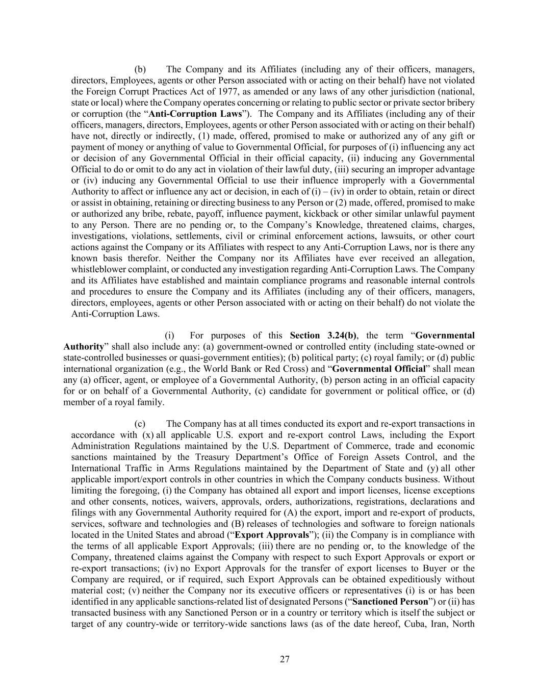 27 (b) The Company and its Affiliates (including any of their officers, managers, directors, Employees, agents or other Person associated with or acting on their behalf) have not violated the Foreign Corrupt Practices Act of 1977, as amended or any laws of any other jurisdiction (national, state or local) where the Company operates concerning or relating to public sector or private sector bribery or corruption (the “Anti-Corruption Laws”). The Company and its Affiliates (including any of their officers, managers, directors, Employees, agents or other Person associated with or acting on their behalf) have not, directly or indirectly, (1) made, offered, promised to make or authorized any of any gift or payment of money or anything of value to Governmental Official, for purposes of (i) influencing any act or decision of any Governmental Official in their official capacity, (ii) inducing any Governmental Official to do or omit to do any act in violation of their lawful duty, (iii) securing an improper advantage or (iv) inducing any Governmental Official to use their influence improperly with a Governmental Authority to affect or influence any act or decision, in each of (i) – (iv) in order to obtain, retain or direct or assist in obtaining, retaining or directing business to any Person or (2) made, offered, promised to make or authorized any bribe, rebate, payoff, influence payment, kickback or other similar unlawful payment to any Person. There are no pending or, to the Company’s Knowledge, threatened claims, charges, investigations, violations, settlements, civil or criminal enforcement actions, lawsuits, or other court actions against the Company or its Affiliates with respect to any Anti-Corruption Laws, nor is there any known basis therefor. Neither the Company nor its Affiliates have ever received an allegation, whistleblower complaint, or conducted any investigation regarding Anti-Corruption Laws. The Company and its Affiliates have established and maintain compliance programs and reasonable internal controls and procedures to ensure the Company and its Affiliates (including any of their officers, managers, directors, employees, agents or other Person associated with or acting on their behalf) do not violate the Anti-Corruption Laws. (i) For purposes of this Section 3.24(b), the term “Governmental Authority” shall also include any: (a) government-owned or controlled entity (including state-owned or state-controlled businesses or quasi-government entities); (b) political party; (c) royal family; or (d) public international organization (e.g., the World Bank or Red Cross) and “Governmental Official” shall mean any (a) officer, agent, or employee of a Governmental Authority, (b) person acting in an official capacity for or on behalf of a Governmental Authority, (c) candidate for government or political office, or (d) member of a royal family. (c) The Company has at all times conducted its export and re-export transactions in accordance with (x) all applicable U.S. export and re-export control Laws, including the Export Administration Regulations maintained by the U.S. Department of Commerce, trade and economic sanctions maintained by the Treasury Department’s Office of Foreign Assets Control, and the International Traffic in Arms Regulations maintained by the Department of State and (y) all other applicable import/export controls in other countries in which the Company conducts business. Without limiting the foregoing, (i) the Company has obtained all export and import licenses, license exceptions and other consents, notices, waivers, approvals, orders, authorizations, registrations, declarations and filings with any Governmental Authority required for (A) the export, import and re-export of products, services, software and technologies and (B) releases of technologies and software to foreign nationals located in the United States and abroad (“Export Approvals”); (ii) the Company is in compliance with the terms of all applicable Export Approvals; (iii) there are no pending or, to the knowledge of the Company, threatened claims against the Company with respect to such Export Approvals or export or re-export transactions; (iv) no Export Approvals for the transfer of export licenses to Buyer or the Company are required, or if required, such Export Approvals can be obtained expeditiously without material cost; (v) neither the Company nor its executive officers or representatives (i) is or has been identified in any applicable sanctions-related list of designated Persons (“Sanctioned Person”) or (ii) has transacted business with any Sanctioned Person or in a country or territory which is itself the subject or target of any country-wide or territory-wide sanctions laws (as of the date hereof, Cuba, Iran, North