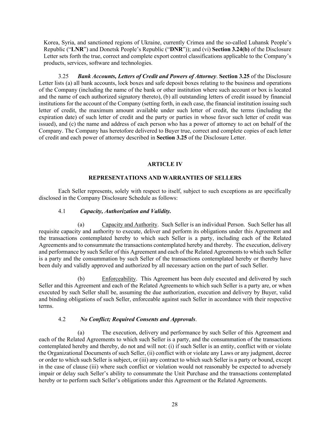 28 Korea, Syria, and sanctioned regions of Ukraine, currently Crimea and the so-called Luhansk People’s Republic (“LNR”) and Donetsk People’s Republic (“DNR”)); and (vi) Section 3.24(b) of the Disclosure Letter sets forth the true, correct and complete export control classifications applicable to the Company’s products, services, software and technologies. 3.25 Bank Accounts, Letters of Credit and Powers of Attorney. Section 3.25 of the Disclosure Letter lists (a) all bank accounts, lock boxes and safe deposit boxes relating to the business and operations of the Company (including the name of the bank or other institution where such account or box is located and the name of each authorized signatory thereto), (b) all outstanding letters of credit issued by financial institutions for the account of the Company (setting forth, in each case, the financial institution issuing such letter of credit, the maximum amount available under such letter of credit, the terms (including the expiration date) of such letter of credit and the party or parties in whose favor such letter of credit was issued), and (c) the name and address of each person who has a power of attorney to act on behalf of the Company. The Company has heretofore delivered to Buyer true, correct and complete copies of each letter of credit and each power of attorney described in Section 3.25 of the Disclosure Letter. ARTICLE IV REPRESENTATIONS AND WARRANTIES OF SELLERS Each Seller represents, solely with respect to itself, subject to such exceptions as are specifically disclosed in the Company Disclosure Schedule as follows: 4.1 Capacity, Authorization and Validity. (a) Capacity and Authority. Such Seller is an individual Person. Such Seller has all requisite capacity and authority to execute, deliver and perform its obligations under this Agreement and the transactions contemplated hereby to which such Seller is a party, including each of the Related Agreements and to consummate the transactions contemplated hereby and thereby. The execution, delivery and performance by such Seller of this Agreement and each of the Related Agreements to which such Seller is a party and the consummation by such Seller of the transactions contemplated hereby or thereby have been duly and validly approved and authorized by all necessary action on the part of such Seller. (b) Enforceability. This Agreement has been duly executed and delivered by such Seller and this Agreement and each of the Related Agreements to which such Seller is a party are, or when executed by such Seller shall be, assuming the due authorization, execution and delivery by Buyer, valid and binding obligations of such Seller, enforceable against such Seller in accordance with their respective terms. 4.2 No Conflict; Required Consents and Approvals. (a) The execution, delivery and performance by such Seller of this Agreement and each of the Related Agreements to which such Seller is a party, and the consummation of the transactions contemplated hereby and thereby, do not and will not: (i) if such Seller is an entity, conflict with or violate the Organizational Documents of such Seller, (ii) conflict with or violate any Laws or any judgment, decree or order to which such Seller is subject, or (iii) any contract to which such Seller is a party or bound, except in the case of clause (iii) where such conflict or violation would not reasonably be expected to adversely impair or delay such Seller’s ability to consummate the Unit Purchase and the transactions contemplated hereby or to perform such Seller’s obligations under this Agreement or the Related Agreements.
