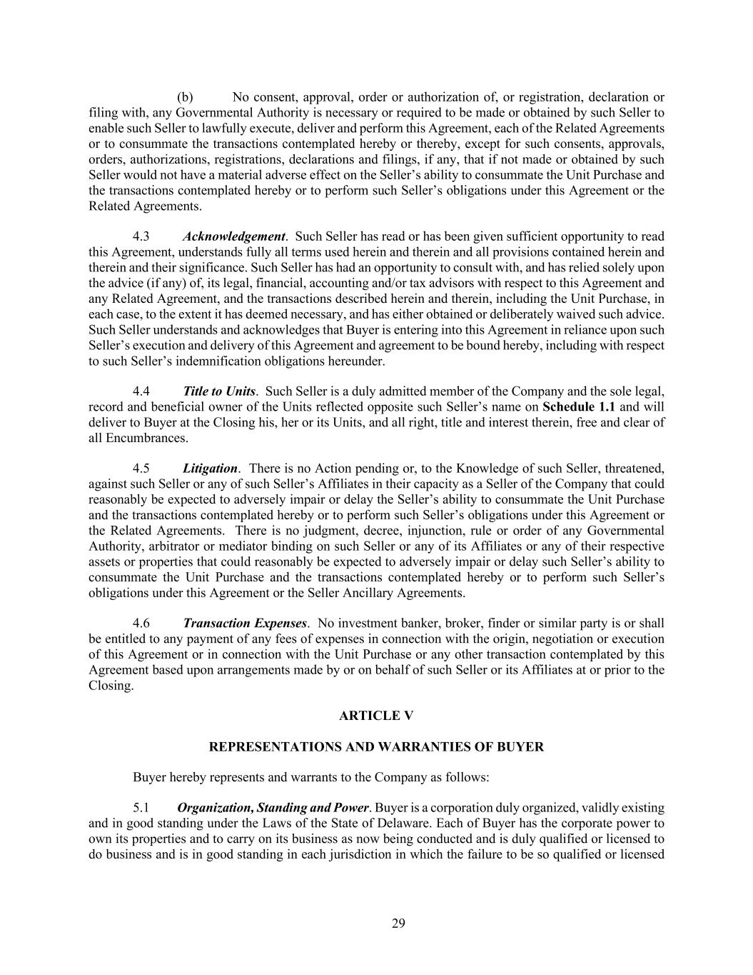 29 (b) No consent, approval, order or authorization of, or registration, declaration or filing with, any Governmental Authority is necessary or required to be made or obtained by such Seller to enable such Seller to lawfully execute, deliver and perform this Agreement, each of the Related Agreements or to consummate the transactions contemplated hereby or thereby, except for such consents, approvals, orders, authorizations, registrations, declarations and filings, if any, that if not made or obtained by such Seller would not have a material adverse effect on the Seller’s ability to consummate the Unit Purchase and the transactions contemplated hereby or to perform such Seller’s obligations under this Agreement or the Related Agreements. 4.3 Acknowledgement. Such Seller has read or has been given sufficient opportunity to read this Agreement, understands fully all terms used herein and therein and all provisions contained herein and therein and their significance. Such Seller has had an opportunity to consult with, and has relied solely upon the advice (if any) of, its legal, financial, accounting and/or tax advisors with respect to this Agreement and any Related Agreement, and the transactions described herein and therein, including the Unit Purchase, in each case, to the extent it has deemed necessary, and has either obtained or deliberately waived such advice. Such Seller understands and acknowledges that Buyer is entering into this Agreement in reliance upon such Seller’s execution and delivery of this Agreement and agreement to be bound hereby, including with respect to such Seller’s indemnification obligations hereunder. 4.4 Title to Units. Such Seller is a duly admitted member of the Company and the sole legal, record and beneficial owner of the Units reflected opposite such Seller’s name on Schedule 1.1 and will deliver to Buyer at the Closing his, her or its Units, and all right, title and interest therein, free and clear of all Encumbrances. 4.5 Litigation. There is no Action pending or, to the Knowledge of such Seller, threatened, against such Seller or any of such Seller’s Affiliates in their capacity as a Seller of the Company that could reasonably be expected to adversely impair or delay the Seller’s ability to consummate the Unit Purchase and the transactions contemplated hereby or to perform such Seller’s obligations under this Agreement or the Related Agreements. There is no judgment, decree, injunction, rule or order of any Governmental Authority, arbitrator or mediator binding on such Seller or any of its Affiliates or any of their respective assets or properties that could reasonably be expected to adversely impair or delay such Seller’s ability to consummate the Unit Purchase and the transactions contemplated hereby or to perform such Seller’s obligations under this Agreement or the Seller Ancillary Agreements. 4.6 Transaction Expenses. No investment banker, broker, finder or similar party is or shall be entitled to any payment of any fees of expenses in connection with the origin, negotiation or execution of this Agreement or in connection with the Unit Purchase or any other transaction contemplated by this Agreement based upon arrangements made by or on behalf of such Seller or its Affiliates at or prior to the Closing. ARTICLE V REPRESENTATIONS AND WARRANTIES OF BUYER Buyer hereby represents and warrants to the Company as follows: 5.1 Organization, Standing and Power. Buyer is a corporation duly organized, validly existing and in good standing under the Laws of the State of Delaware. Each of Buyer has the corporate power to own its properties and to carry on its business as now being conducted and is duly qualified or licensed to do business and is in good standing in each jurisdiction in which the failure to be so qualified or licensed