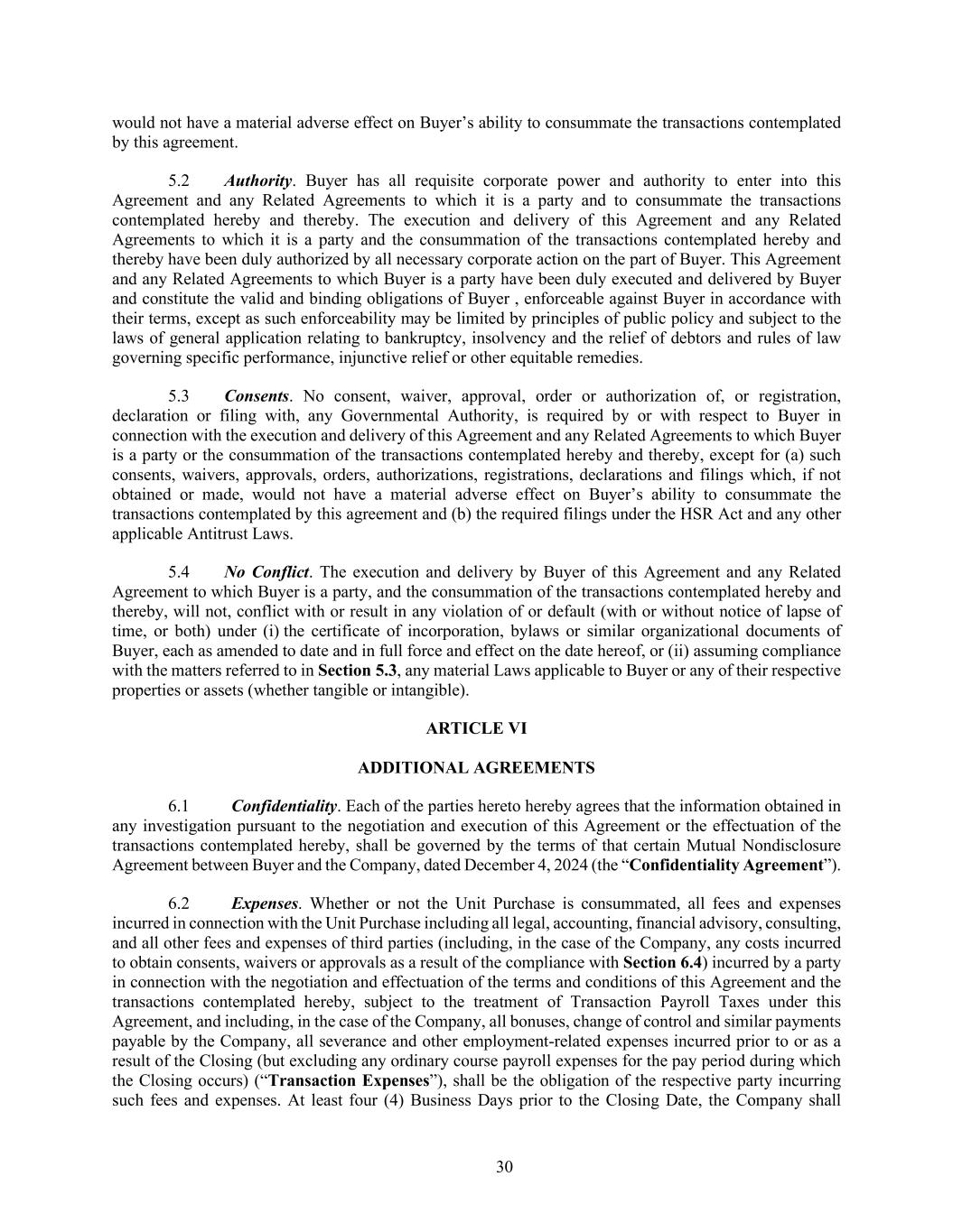 30 would not have a material adverse effect on Buyer’s ability to consummate the transactions contemplated by this agreement. 5.2 Authority. Buyer has all requisite corporate power and authority to enter into this Agreement and any Related Agreements to which it is a party and to consummate the transactions contemplated hereby and thereby. The execution and delivery of this Agreement and any Related Agreements to which it is a party and the consummation of the transactions contemplated hereby and thereby have been duly authorized by all necessary corporate action on the part of Buyer. This Agreement and any Related Agreements to which Buyer is a party have been duly executed and delivered by Buyer and constitute the valid and binding obligations of Buyer , enforceable against Buyer in accordance with their terms, except as such enforceability may be limited by principles of public policy and subject to the laws of general application relating to bankruptcy, insolvency and the relief of debtors and rules of law governing specific performance, injunctive relief or other equitable remedies. 5.3 Consents. No consent, waiver, approval, order or authorization of, or registration, declaration or filing with, any Governmental Authority, is required by or with respect to Buyer in connection with the execution and delivery of this Agreement and any Related Agreements to which Buyer is a party or the consummation of the transactions contemplated hereby and thereby, except for (a) such consents, waivers, approvals, orders, authorizations, registrations, declarations and filings which, if not obtained or made, would not have a material adverse effect on Buyer’s ability to consummate the transactions contemplated by this agreement and (b) the required filings under the HSR Act and any other applicable Antitrust Laws. 5.4 No Conflict. The execution and delivery by Buyer of this Agreement and any Related Agreement to which Buyer is a party, and the consummation of the transactions contemplated hereby and thereby, will not, conflict with or result in any violation of or default (with or without notice of lapse of time, or both) under (i) the certificate of incorporation, bylaws or similar organizational documents of Buyer, each as amended to date and in full force and effect on the date hereof, or (ii) assuming compliance with the matters referred to in Section 5.3, any material Laws applicable to Buyer or any of their respective properties or assets (whether tangible or intangible). ARTICLE VI ADDITIONAL AGREEMENTS 6.1 Confidentiality. Each of the parties hereto hereby agrees that the information obtained in any investigation pursuant to the negotiation and execution of this Agreement or the effectuation of the transactions contemplated hereby, shall be governed by the terms of that certain Mutual Nondisclosure Agreement between Buyer and the Company, dated December 4, 2024 (the “Confidentiality Agreement”). 6.2 Expenses. Whether or not the Unit Purchase is consummated, all fees and expenses incurred in connection with the Unit Purchase including all legal, accounting, financial advisory, consulting, and all other fees and expenses of third parties (including, in the case of the Company, any costs incurred to obtain consents, waivers or approvals as a result of the compliance with Section 6.4) incurred by a party in connection with the negotiation and effectuation of the terms and conditions of this Agreement and the transactions contemplated hereby, subject to the treatment of Transaction Payroll Taxes under this Agreement, and including, in the case of the Company, all bonuses, change of control and similar payments payable by the Company, all severance and other employment-related expenses incurred prior to or as a result of the Closing (but excluding any ordinary course payroll expenses for the pay period during which the Closing occurs) (“Transaction Expenses”), shall be the obligation of the respective party incurring such fees and expenses. At least four (4) Business Days prior to the Closing Date, the Company shall