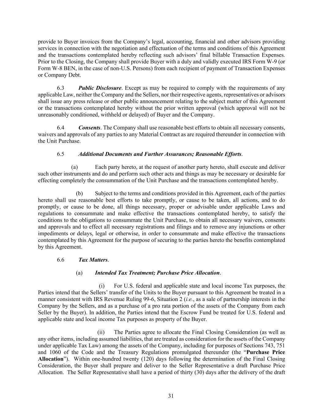 31 provide to Buyer invoices from the Company’s legal, accounting, financial and other advisors providing services in connection with the negotiation and effectuation of the terms and conditions of this Agreement and the transactions contemplated hereby reflecting such advisors’ final billable Transaction Expenses. Prior to the Closing, the Company shall provide Buyer with a duly and validly executed IRS Form W-9 (or Form W-8 BEN, in the case of non-U.S. Persons) from each recipient of payment of Transaction Expenses or Company Debt. 6.3 Public Disclosure. Except as may be required to comply with the requirements of any applicable Law, neither the Company and the Sellers, nor their respective agents, representatives or advisors shall issue any press release or other public announcement relating to the subject matter of this Agreement or the transactions contemplated hereby without the prior written approval (which approval will not be unreasonably conditioned, withheld or delayed) of Buyer and the Company. 6.4 Consents. The Company shall use reasonable best efforts to obtain all necessary consents, waivers and approvals of any parties to any Material Contract as are required thereunder in connection with the Unit Purchase. 6.5 Additional Documents and Further Assurances; Reasonable Efforts. (a) Each party hereto, at the request of another party hereto, shall execute and deliver such other instruments and do and perform such other acts and things as may be necessary or desirable for effecting completely the consummation of the Unit Purchase and the transactions contemplated hereby. (b) Subject to the terms and conditions provided in this Agreement, each of the parties hereto shall use reasonable best efforts to take promptly, or cause to be taken, all actions, and to do promptly, or cause to be done, all things necessary, proper or advisable under applicable Laws and regulations to consummate and make effective the transactions contemplated hereby, to satisfy the conditions to the obligations to consummate the Unit Purchase, to obtain all necessary waivers, consents and approvals and to effect all necessary registrations and filings and to remove any injunctions or other impediments or delays, legal or otherwise, in order to consummate and make effective the transactions contemplated by this Agreement for the purpose of securing to the parties hereto the benefits contemplated by this Agreement. 6.6 Tax Matters. (a) Intended Tax Treatment; Purchase Price Allocation. (i) For U.S. federal and applicable state and local income Tax purposes, the Parties intend that the Sellers’ transfer of the Units to the Buyer pursuant to this Agreement be treated in a manner consistent with IRS Revenue Ruling 99-6, Situation 2 (i.e., as a sale of partnership interests in the Company by the Sellers, and as a purchase of a pro rata portion of the assets of the Company from each Seller by the Buyer). In addition, the Parties intend that the Escrow Fund be treated for U.S. federal and applicable state and local income Tax purposes as property of the Buyer. (ii) The Parties agree to allocate the Final Closing Consideration (as well as any other items, including assumed liabilities, that are treated as consideration for the assets of the Company under applicable Tax Law) among the assets of the Company, including for purposes of Sections 743, 751 and 1060 of the Code and the Treasury Regulations promulgated thereunder (the “Purchase Price Allocation”). Within one-hundred twenty (120) days following the determination of the Final Closing Consideration, the Buyer shall prepare and deliver to the Seller Representative a draft Purchase Price Allocation. The Seller Representative shall have a period of thirty (30) days after the delivery of the draft