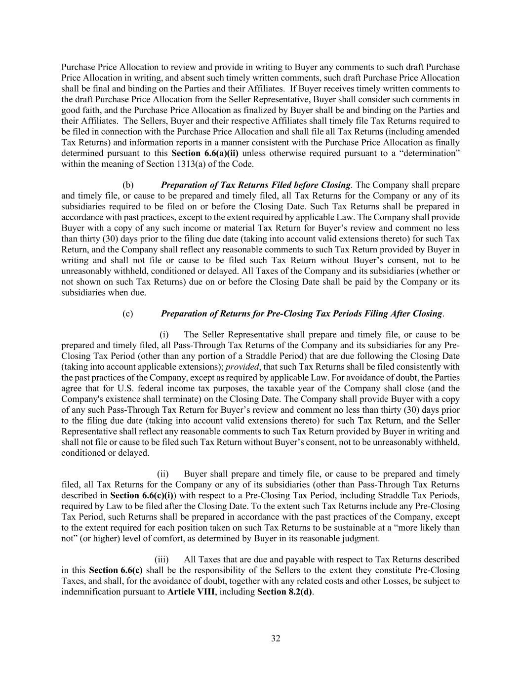 32 Purchase Price Allocation to review and provide in writing to Buyer any comments to such draft Purchase Price Allocation in writing, and absent such timely written comments, such draft Purchase Price Allocation shall be final and binding on the Parties and their Affiliates. If Buyer receives timely written comments to the draft Purchase Price Allocation from the Seller Representative, Buyer shall consider such comments in good faith, and the Purchase Price Allocation as finalized by Buyer shall be and binding on the Parties and their Affiliates. The Sellers, Buyer and their respective Affiliates shall timely file Tax Returns required to be filed in connection with the Purchase Price Allocation and shall file all Tax Returns (including amended Tax Returns) and information reports in a manner consistent with the Purchase Price Allocation as finally determined pursuant to this Section 6.6(a)(ii) unless otherwise required pursuant to a “determination” within the meaning of Section 1313(a) of the Code. (b) Preparation of Tax Returns Filed before Closing. The Company shall prepare and timely file, or cause to be prepared and timely filed, all Tax Returns for the Company or any of its subsidiaries required to be filed on or before the Closing Date. Such Tax Returns shall be prepared in accordance with past practices, except to the extent required by applicable Law. The Company shall provide Buyer with a copy of any such income or material Tax Return for Buyer’s review and comment no less than thirty (30) days prior to the filing due date (taking into account valid extensions thereto) for such Tax Return, and the Company shall reflect any reasonable comments to such Tax Return provided by Buyer in writing and shall not file or cause to be filed such Tax Return without Buyer’s consent, not to be unreasonably withheld, conditioned or delayed. All Taxes of the Company and its subsidiaries (whether or not shown on such Tax Returns) due on or before the Closing Date shall be paid by the Company or its subsidiaries when due. (c) Preparation of Returns for Pre-Closing Tax Periods Filing After Closing. (i) The Seller Representative shall prepare and timely file, or cause to be prepared and timely filed, all Pass-Through Tax Returns of the Company and its subsidiaries for any Pre- Closing Tax Period (other than any portion of a Straddle Period) that are due following the Closing Date (taking into account applicable extensions); provided, that such Tax Returns shall be filed consistently with the past practices of the Company, except as required by applicable Law. For avoidance of doubt, the Parties agree that for U.S. federal income tax purposes, the taxable year of the Company shall close (and the Company's existence shall terminate) on the Closing Date. The Company shall provide Buyer with a copy of any such Pass-Through Tax Return for Buyer’s review and comment no less than thirty (30) days prior to the filing due date (taking into account valid extensions thereto) for such Tax Return, and the Seller Representative shall reflect any reasonable comments to such Tax Return provided by Buyer in writing and shall not file or cause to be filed such Tax Return without Buyer’s consent, not to be unreasonably withheld, conditioned or delayed. (ii) Buyer shall prepare and timely file, or cause to be prepared and timely filed, all Tax Returns for the Company or any of its subsidiaries (other than Pass-Through Tax Returns described in Section 6.6(c)(i)) with respect to a Pre-Closing Tax Period, including Straddle Tax Periods, required by Law to be filed after the Closing Date. To the extent such Tax Returns include any Pre-Closing Tax Period, such Returns shall be prepared in accordance with the past practices of the Company, except to the extent required for each position taken on such Tax Returns to be sustainable at a “more likely than not” (or higher) level of comfort, as determined by Buyer in its reasonable judgment. (iii) All Taxes that are due and payable with respect to Tax Returns described in this Section 6.6(c) shall be the responsibility of the Sellers to the extent they constitute Pre-Closing Taxes, and shall, for the avoidance of doubt, together with any related costs and other Losses, be subject to indemnification pursuant to Article VIII, including Section 8.2(d).